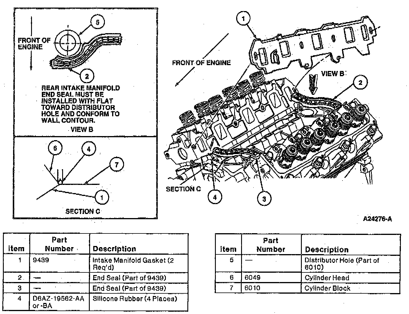 4. Apply a 5-6 mm (0.25 inch) drop of Silicone Rubber D6AZ-19562-AA or BA or equivalent meeting Ford specifications ESB-M4G92-A and ESE-M4G195-A to intersection of cylinder block and cylinder head at four corners as shown in the Intake Manifold Gasket illustration.