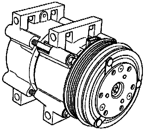 - Five double-acting pistons, positioned axially around the compressor shaft, operate within the cylinder assembly. The pistons are started by a swashplate that is pressed on the compressor shaft.