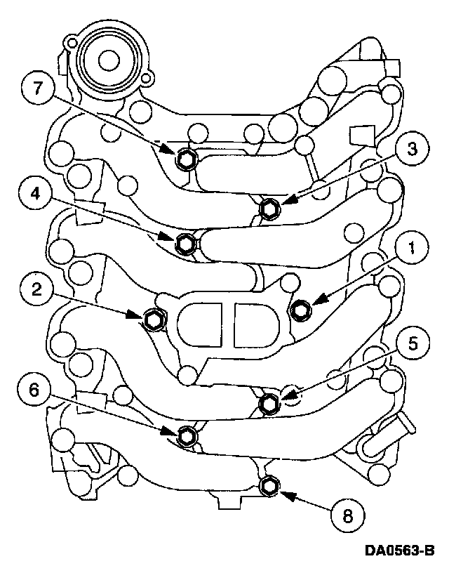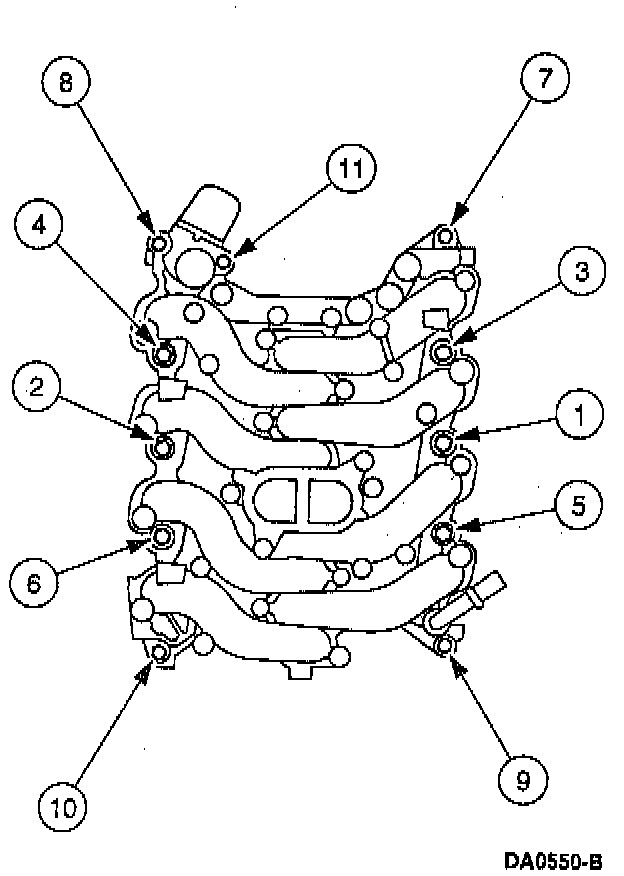 Tighten the upper intake manifold bolts in two stages, in the sequence shown: