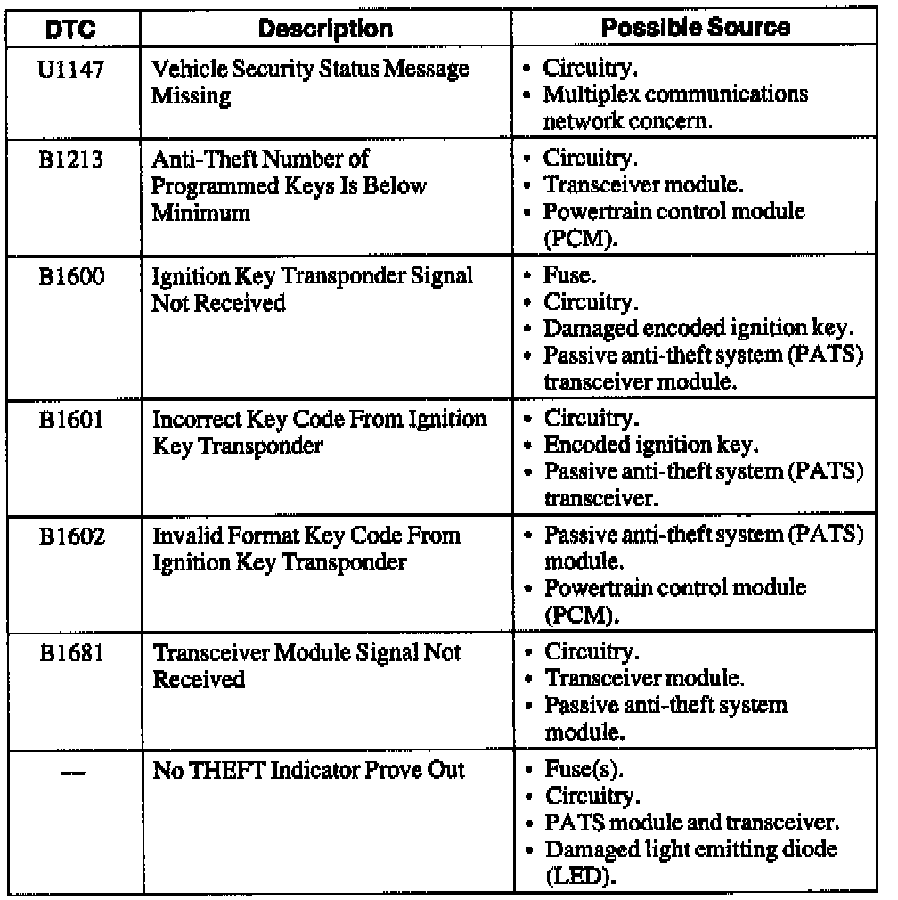 Passive Anti-Theft System (PATS) DTC Reference Chart