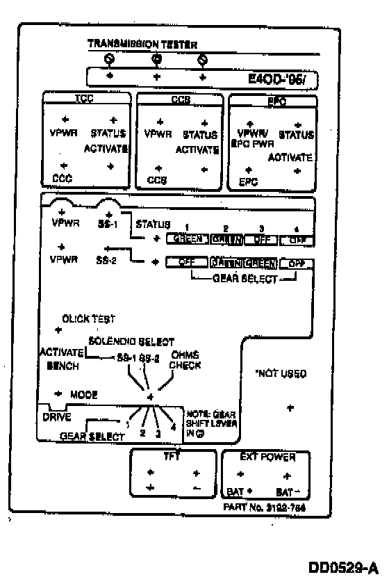 DESCRIPTIONUse the Transmission Tester to diagnose electronically controlled transmissions. The following instructions describe the setup and use of this tester in the pinpoint tests for the E4OD.