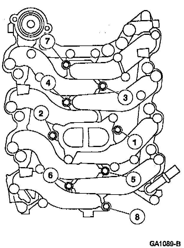 Tighten the lower intake manifold bolts in two stages, in the sequence shown: