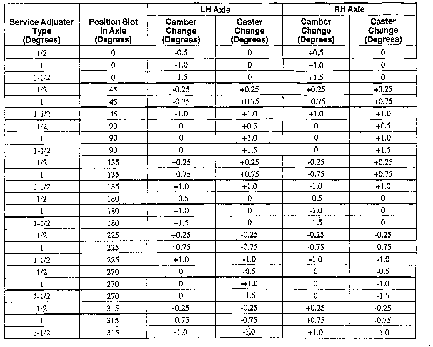 Camber/Caster Service Adjuster Chart