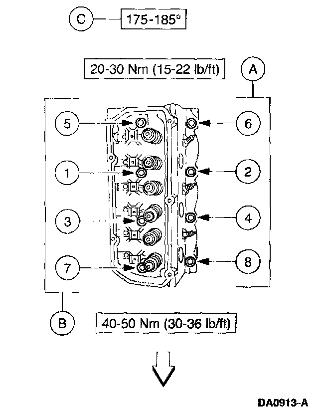 In the sequence shown, loosen the bolts three turns, then tighten the (A) short bolt or (B) long bolt to the specification indicated, and then further tighten the bolt to the (C) degrees indicated.