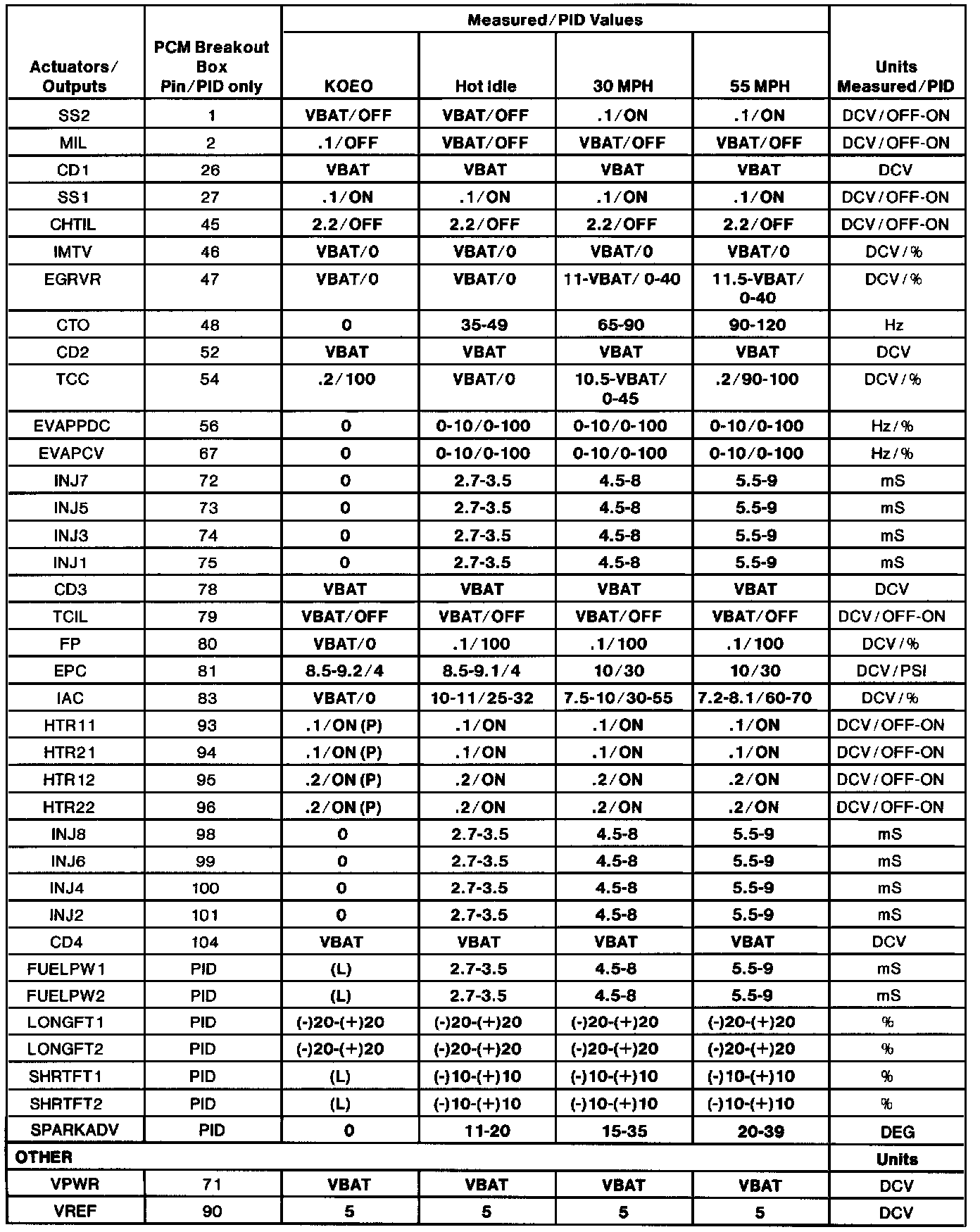 - The Typical Diagnostic Reference Value Charts do not display fault PIDs. These are PIDs which indicate a hard fault with the circuit. They display a value of "YES" or "NO" and are PIDs ending with an "F". These do not include EVAPPF, FF, MAF or VREF.
