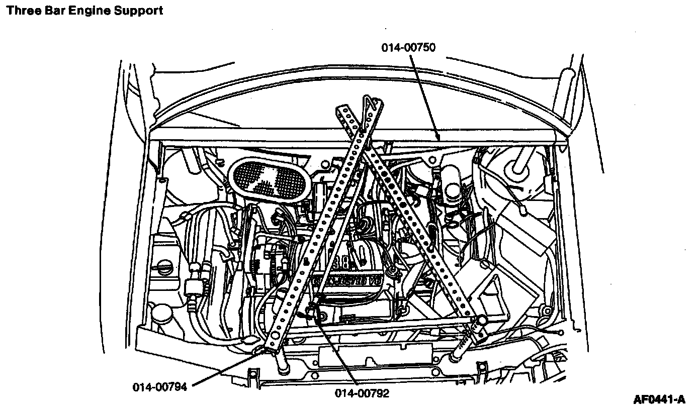 5. Install Rotunda Engine Lift Bracket Set 014-00792, Three Bar Engine Support 014-00750, and 3 Bar Adapter Set 014-00794 or equivalent on engine and transaxle assembly.