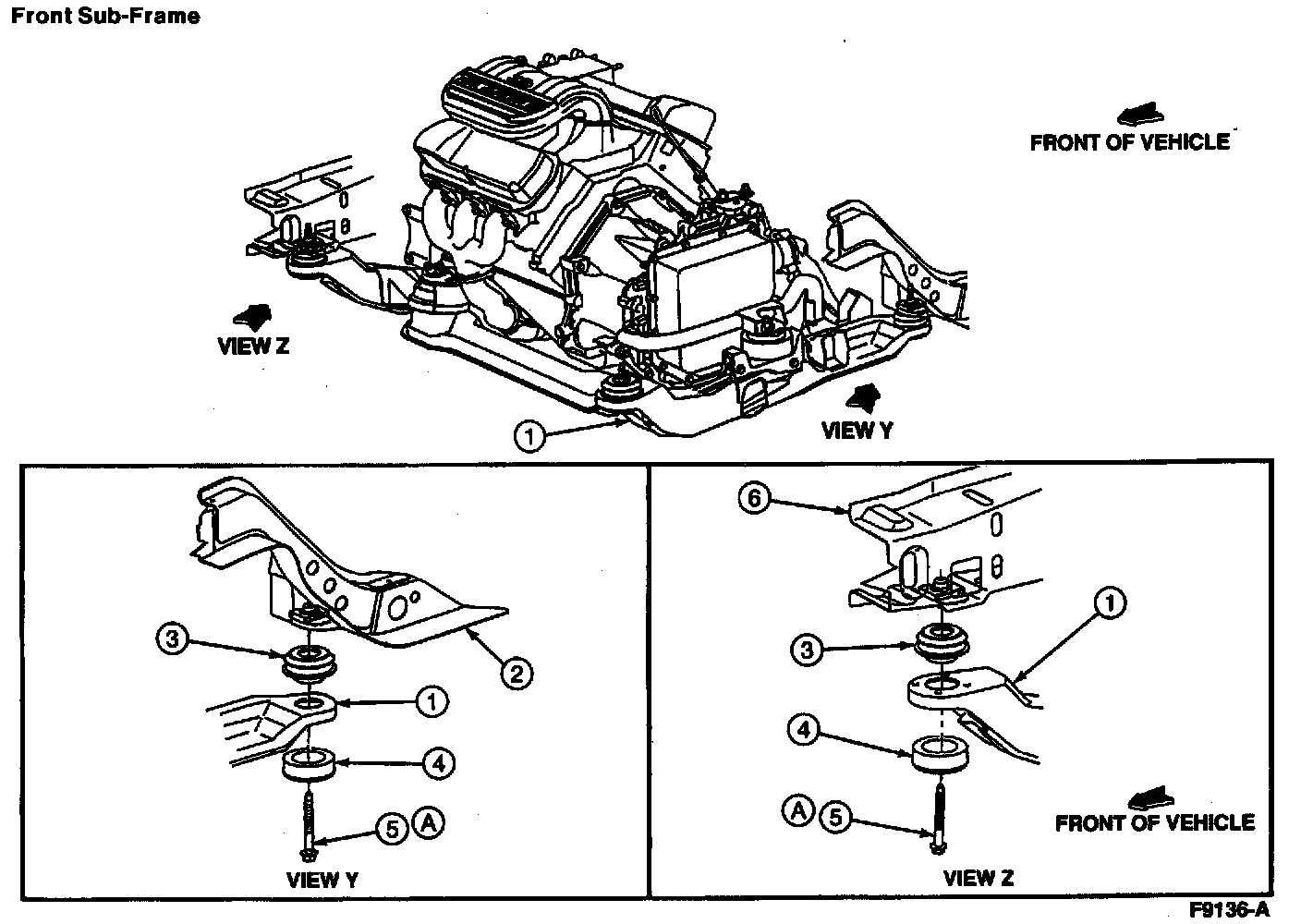 5. Install front sub-frame with Rotunda Hi-Lift Jack 014-00942 and Rotunda Sub-Frame Removal Kit 014-00751 or equivalent. Guide studs on front engine support insulators (6038) and engine and transmission support insulator (6F063) into brackets.