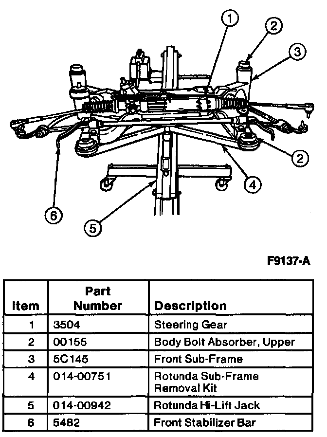 19. Support front sub-frame with Rotunda Hi-Lift Jack 014-00942 and Rotunda Sub-Frame Removal Kit 014-00751 or equivalent.