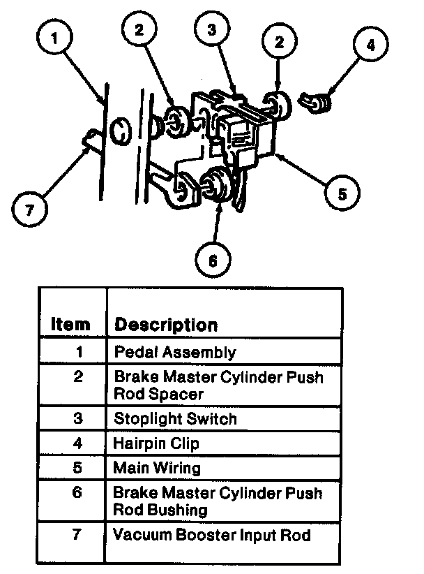 2. Remove the hairpin clip and slide stoplight switch, push rod, nylon washer and brake master cylinder push rod bushing away from the brake pedal.