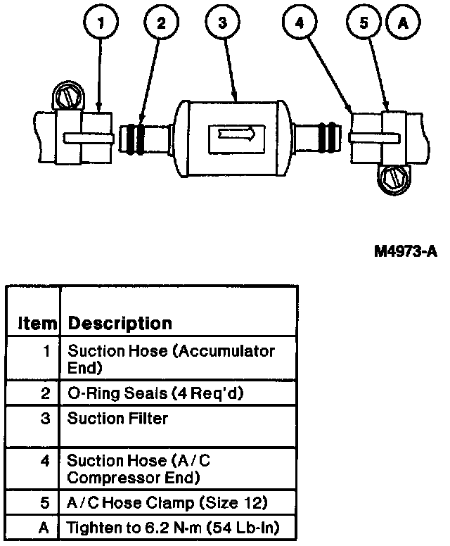 11. Remove a length of suction hose (close to the compressor end) to accommodate the suction filter and install the filter, using A/C hose clamps. Be sure filter is correctly oriented for refrigerant system flow. Check the label on the filter. The size 12 clamps must be positioned over the O-ring seals on the end tubes and tightened to 6.2 Nm (54 Lb-In).