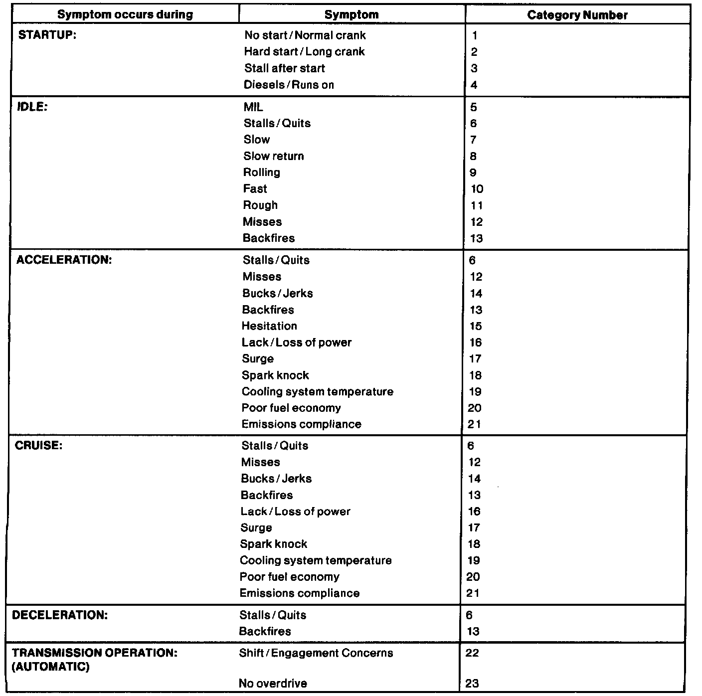 The Reference Value Symptom Chart is used to provide guidance in selecting the appropriate PID or measured signal related to the fault area. Select a symptom from the symptom chart along with the category number and proceed to the PID/Measured Signal Chart. For multiple symptoms, select the most evident. Reference Value PID/Measured Signal Chart