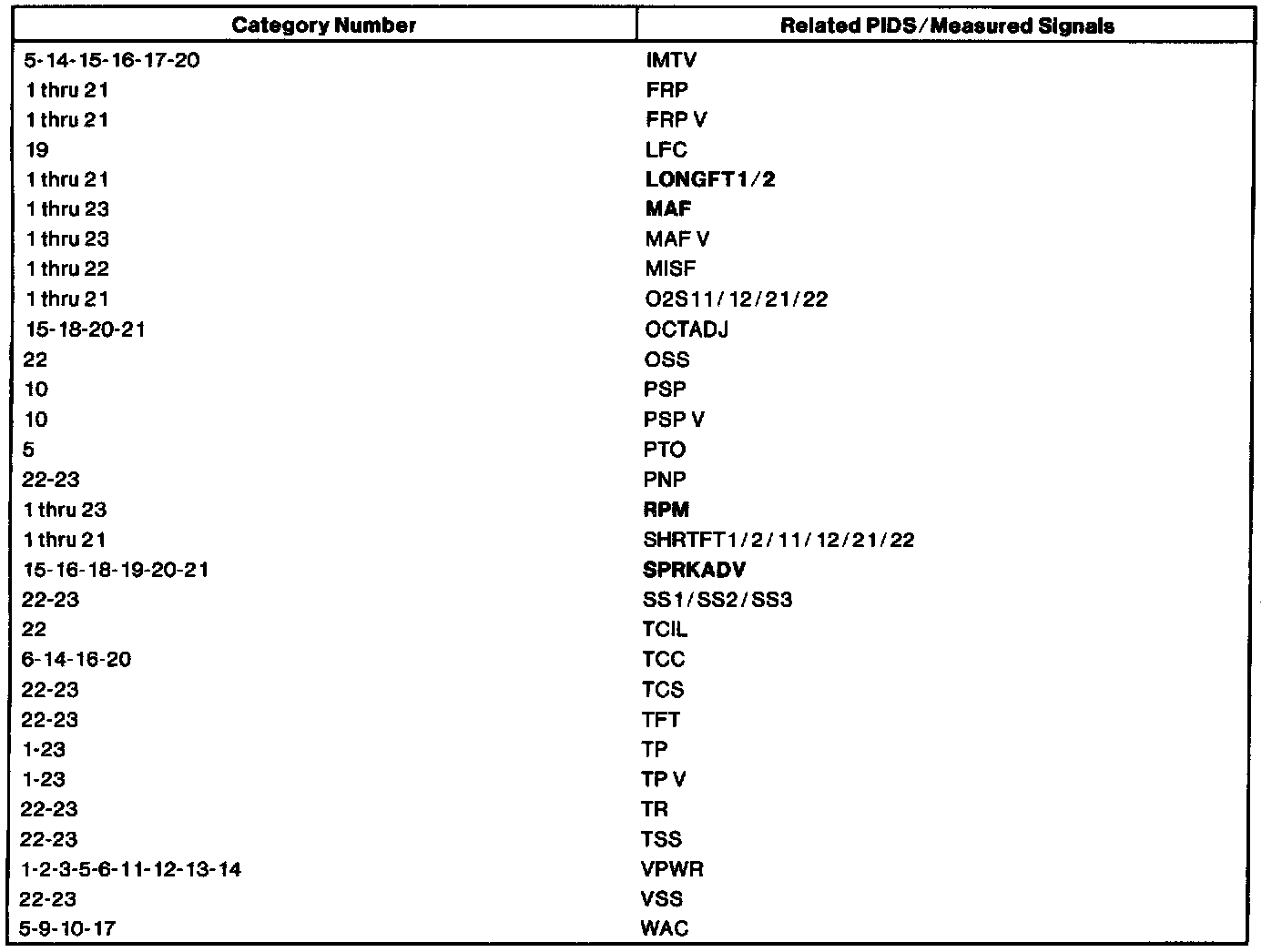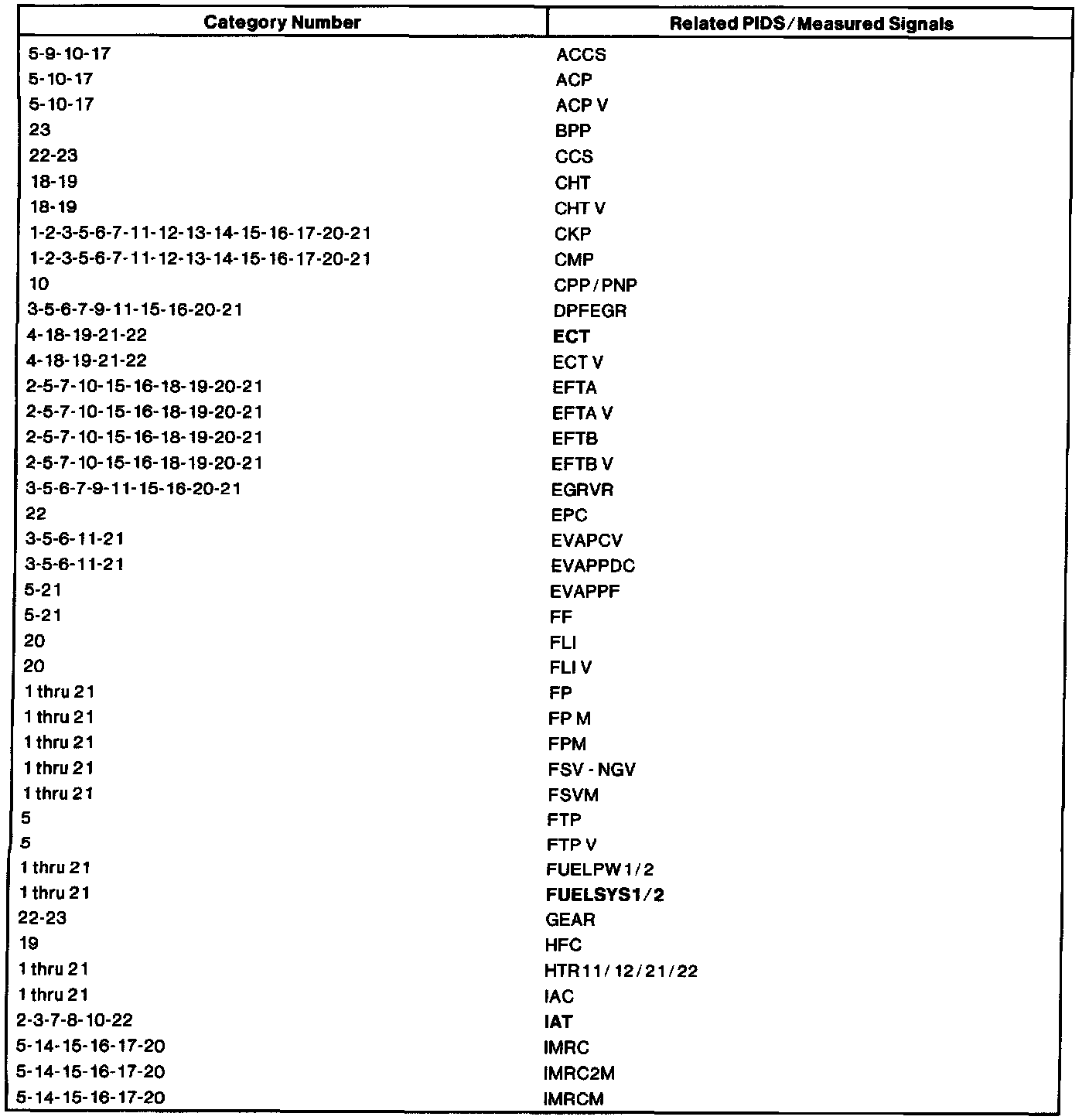 The listing reflects PIDs and/or measured values which may reveal a possible concern within each system shown. Match the category number with the related PID/measured signal and proceed to the Typical Diagnostic Reference Value Charts.NOTE: