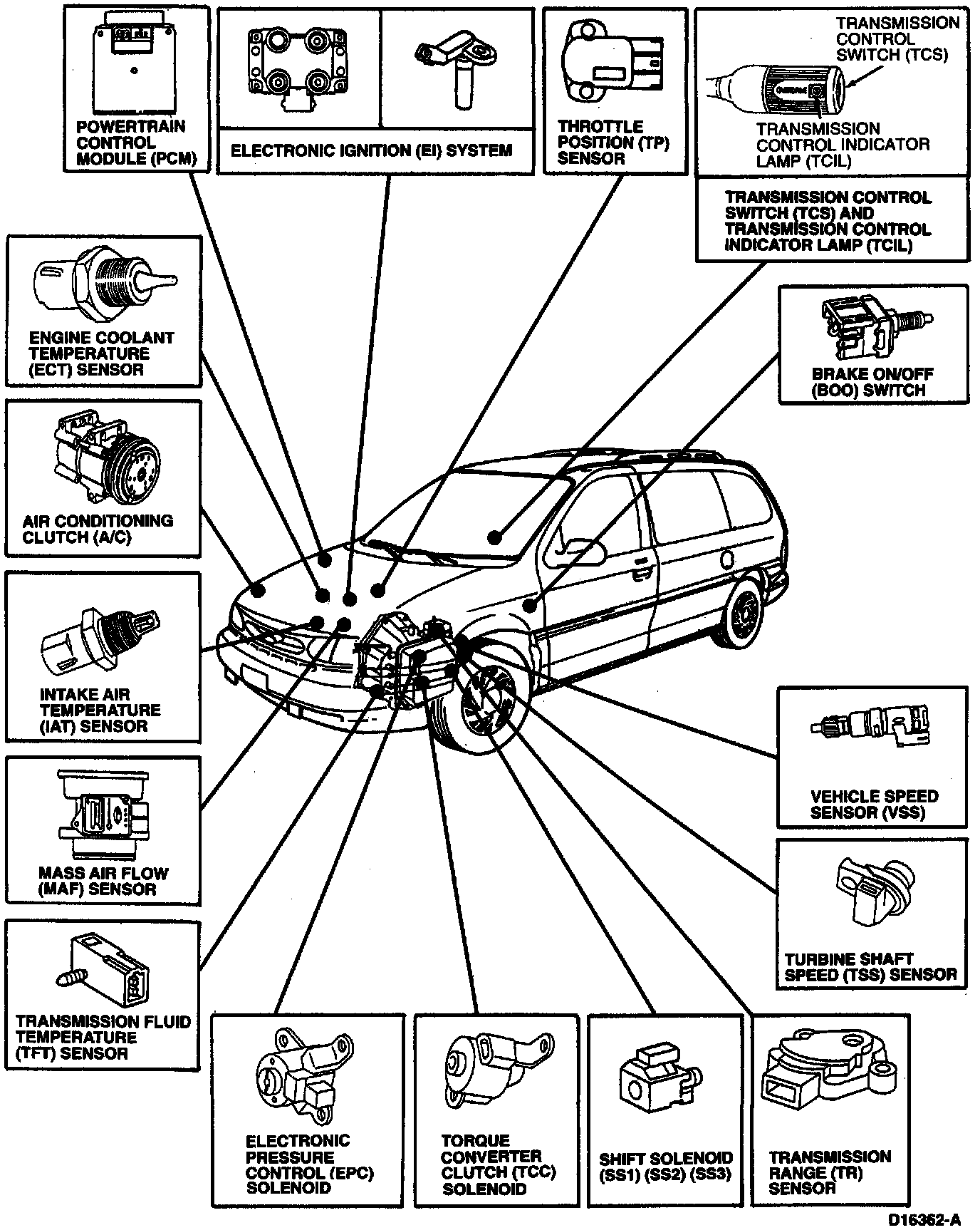 Some input signals come from the engine-related sensors, for example, Mass Air Flow Sensor (MAF Sensor) and Engine Coolant Temperature Sensor (ECT Sensor) to give the powertrain control module an idea of the load and climate under which the engine is operating. Some other inputs are based on driver inputs, such as accelerator pedal position which is related to the powertrain control module by the Throttle Position Sensor (TP Sensor). Still other inputs are provided by the transaxle itself, from sensors such as the Vehicle Speed Sensor (VSS), Transmission Range (TR) sensor (controlled by the placement of the transaxle range selector lever) and the transmission fluid temperature sensor (TFT).