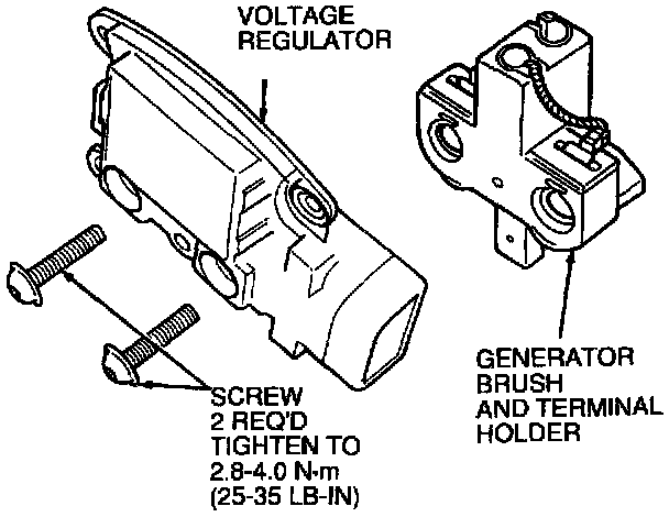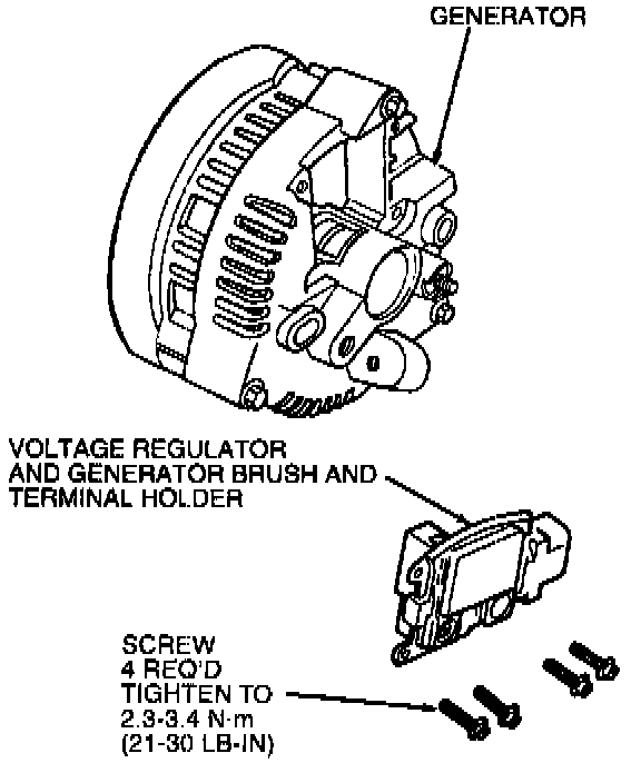 4. Attach the voltage regulator and generator brush and terminal holder to the Generator (GEN) with attaching screws. Tighten to 2.3-3.4 N.m (20-30 Lb-In).