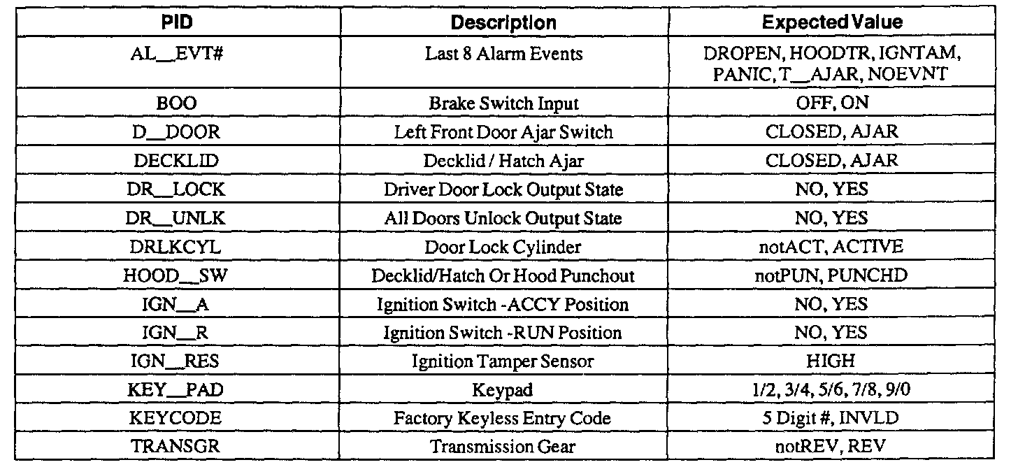 Remote Anti-Theft Module Parameter Identification (PID) Index