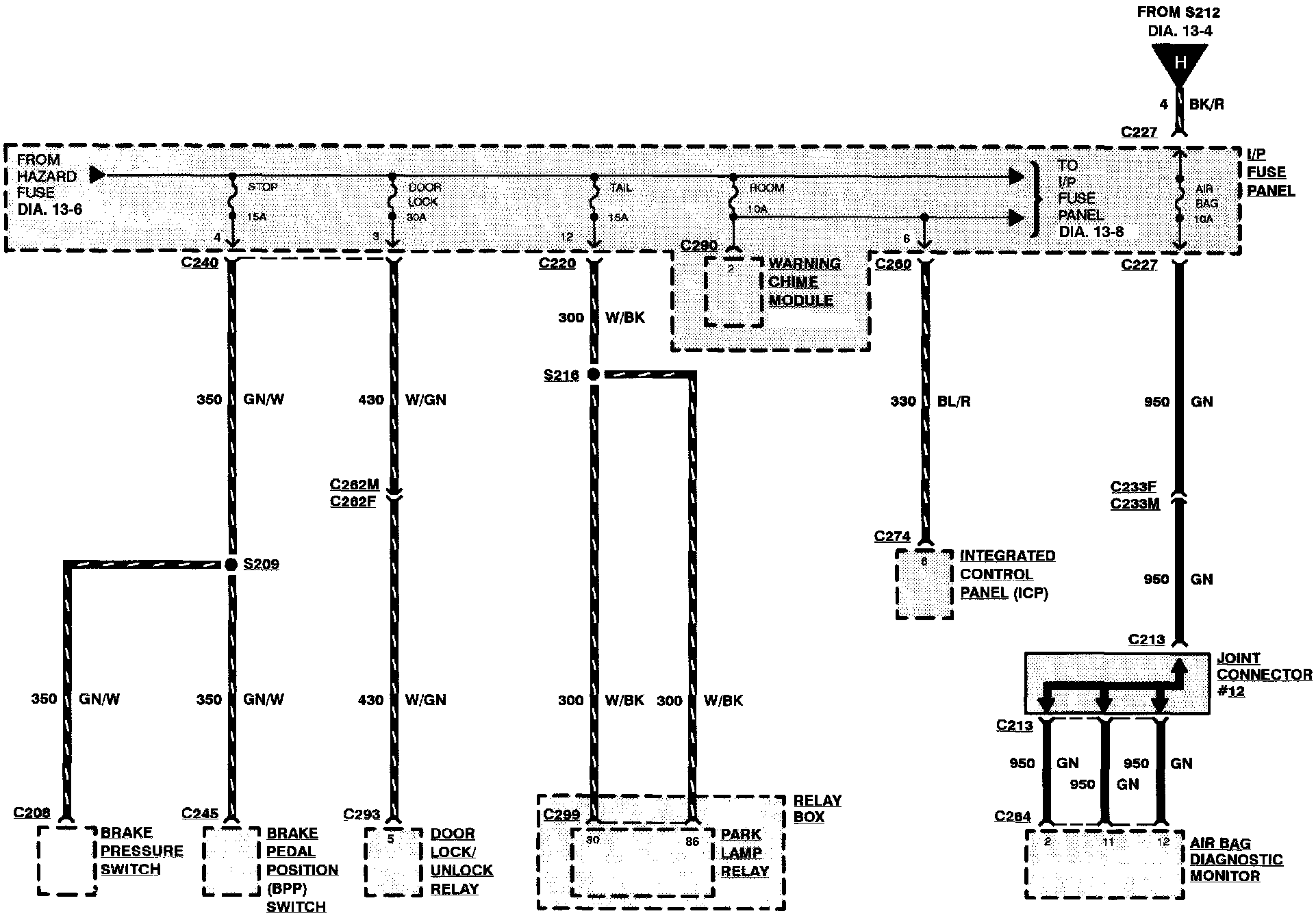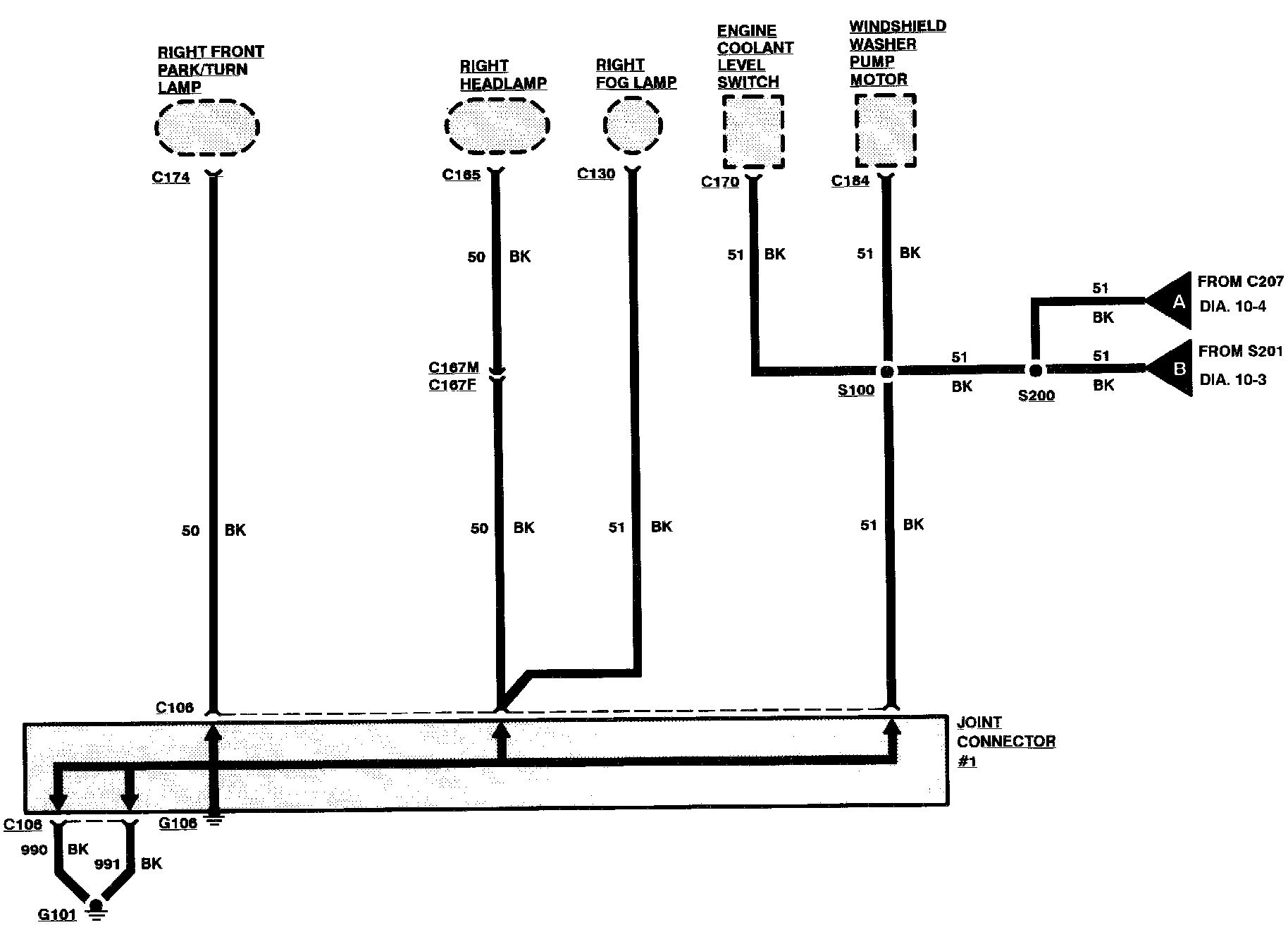 Components that work together are shown together in a system/subsystem diagram or set of diagrams. The system feed (circuit breaker, fuse, etc.) is shown at the top of a diagram page. All wires, connectors, components, and splices are shown in the same manner that the current flows, ending at the ground at the bottom of a diagram page. Circuits that go from one diagram page to another will be marked with large arrow heads indicating which diagram page the circuit went to/came from.