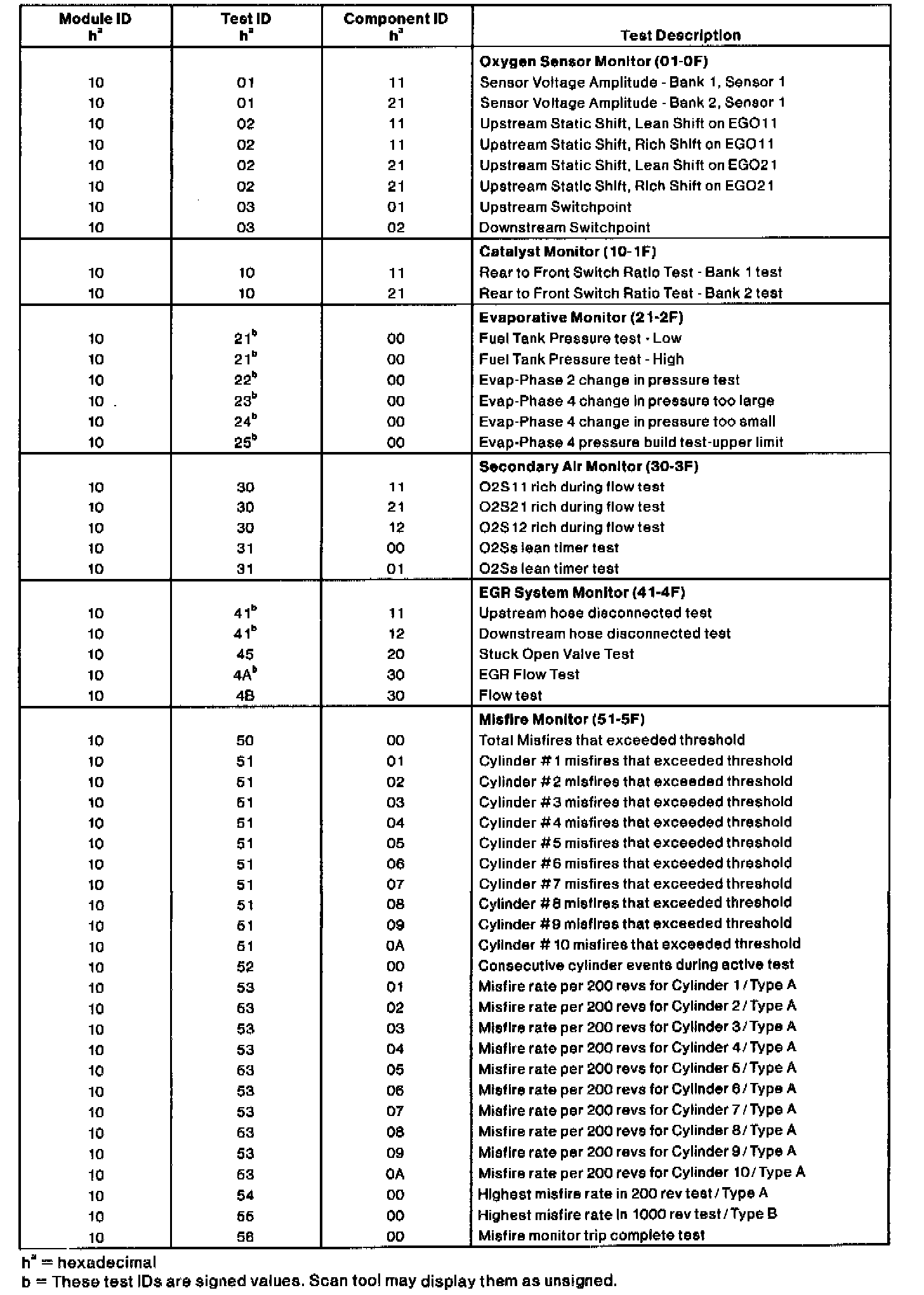 The purpose of this test mode is to allow access to the results of OBD II monitor diagnostic test results. The test values that are stored at the time of the particular monitor completion are displayed when the particular test identification is requested. Refer to the following table for test information.
