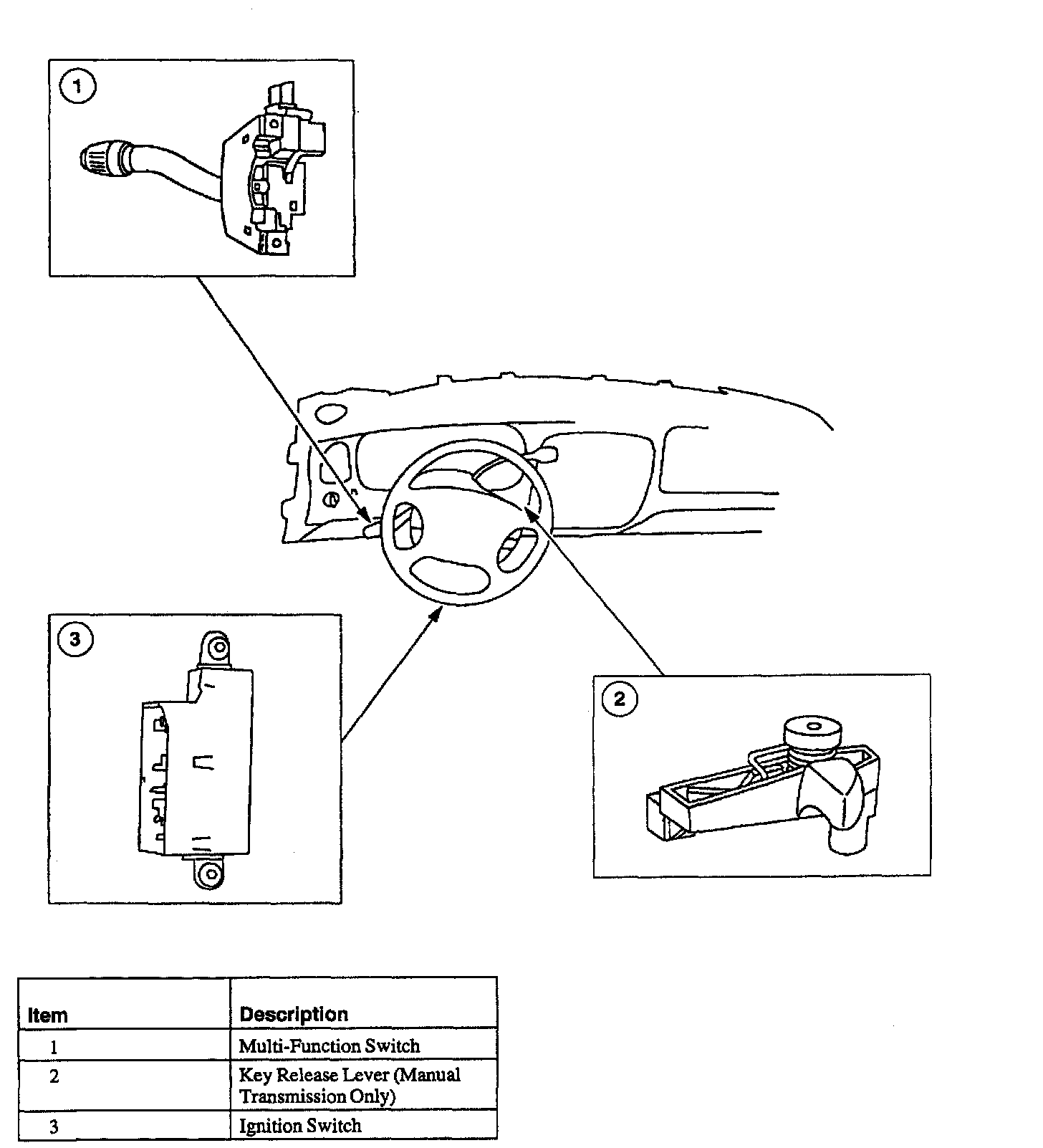 The ignition switch is mounted below the steering column and is activated by rotating the key lock cylinder on the steering column.
