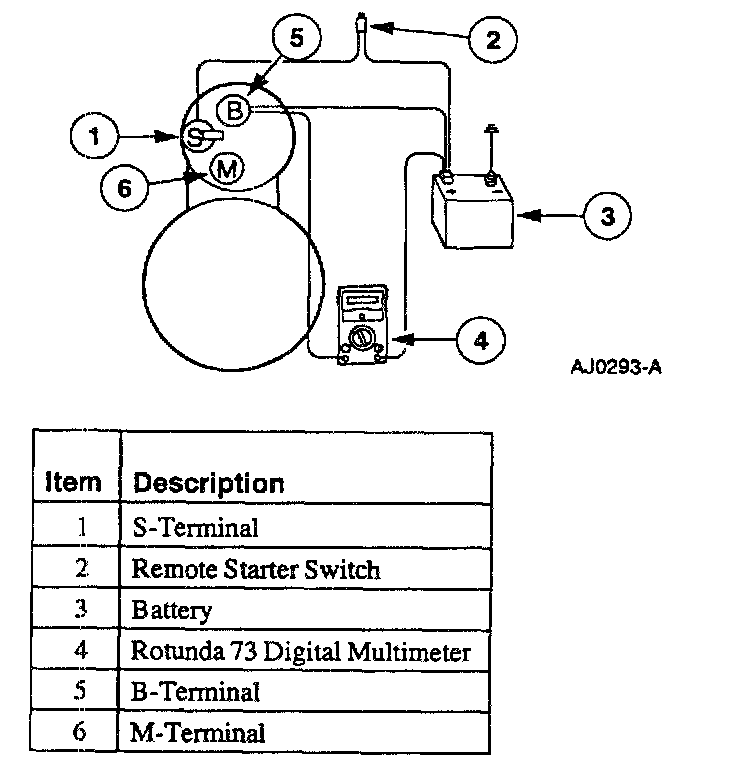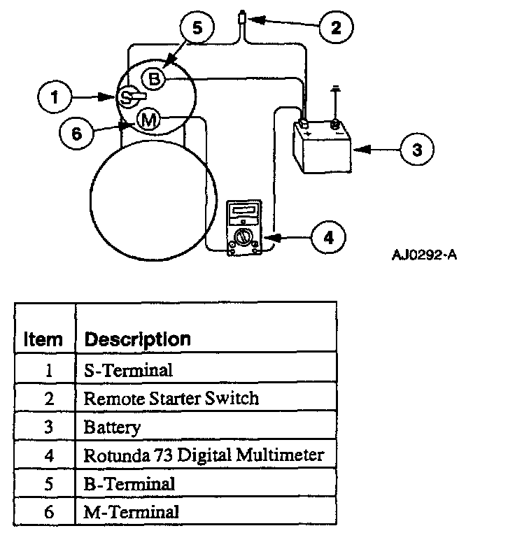 8. Remove the cables from solenoid B-, S- and M-terminals. Clean the cables and connections and reinstall the cables to the proper terminals. Repeat Steps 3 through 6. If the voltage drop reading is still greater than 0.5 volts when checked at the M-terminal or less than 0.5 volts when checked at the B-terminal, the concern is in the solenoid contacts. Replace the starter motor.