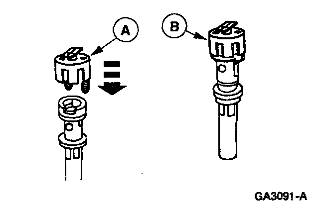 1. Install (A) Synchro Positioning Tool, aligning tabs and notches with those on the (B) camshaft synchronizer.
