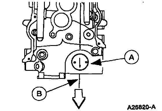 3. When installing the camshaft synchronizer into the cylinder block, make sure that the arrow on (A) Synchro Positioning Tool is pointing toward the front of the vehicle, on a (B) line that is parallel to the center line of the crankshaft.