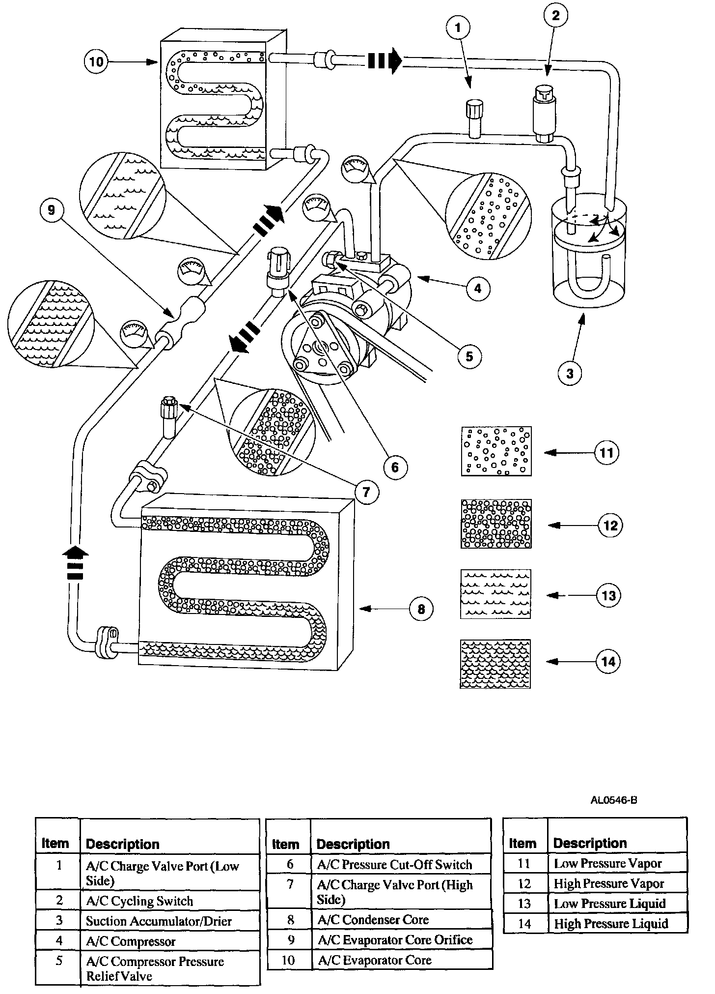 The A/C condenser core, being close to ambient temperature, causes the refrigerant vapor to condense into a liquid when heat is removed from the refrigerant by ambient air passing over the fins and tubing. The now liquid refrigerant, still at high pressure, exits from the bottom of the A/C condenser core and enters the inlet side of the A/C evaporator core orifice.