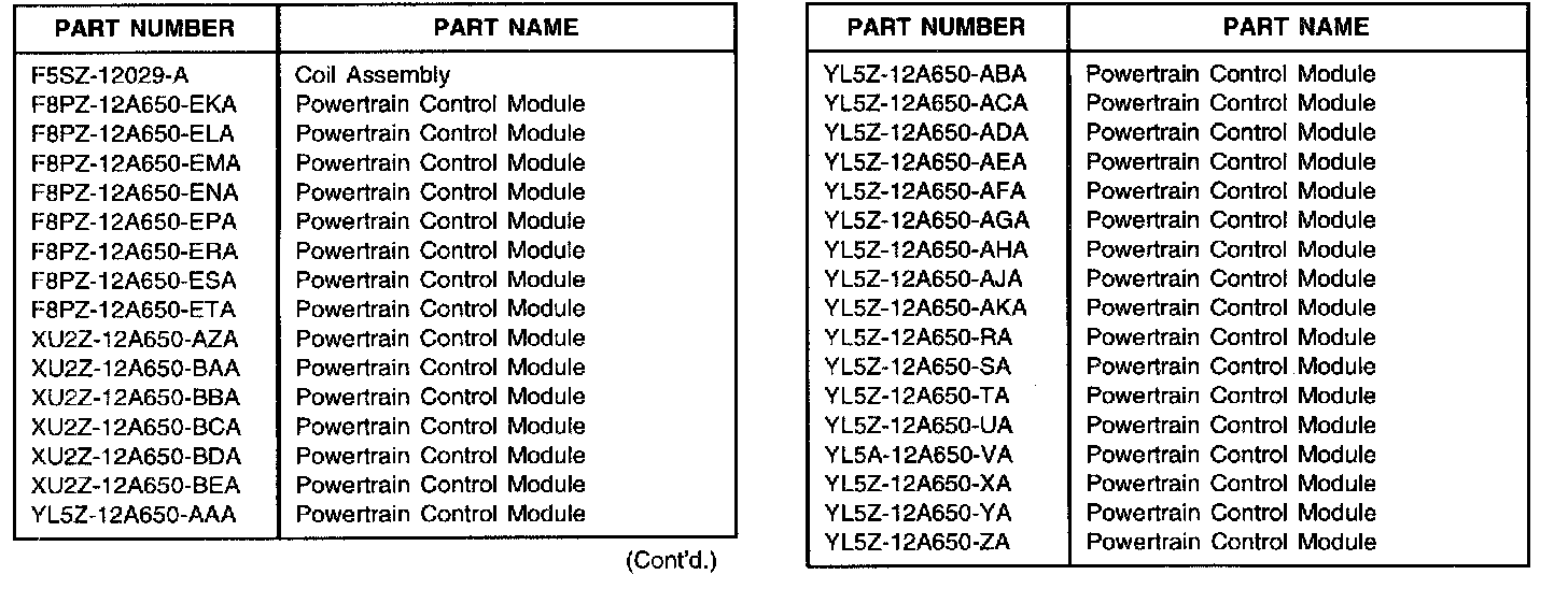 7. Replace the PCM Assembly with a revised PCM assembly as per chart. Refer to the appropriate Ranger Workshop Manual for removal and installation procedures.