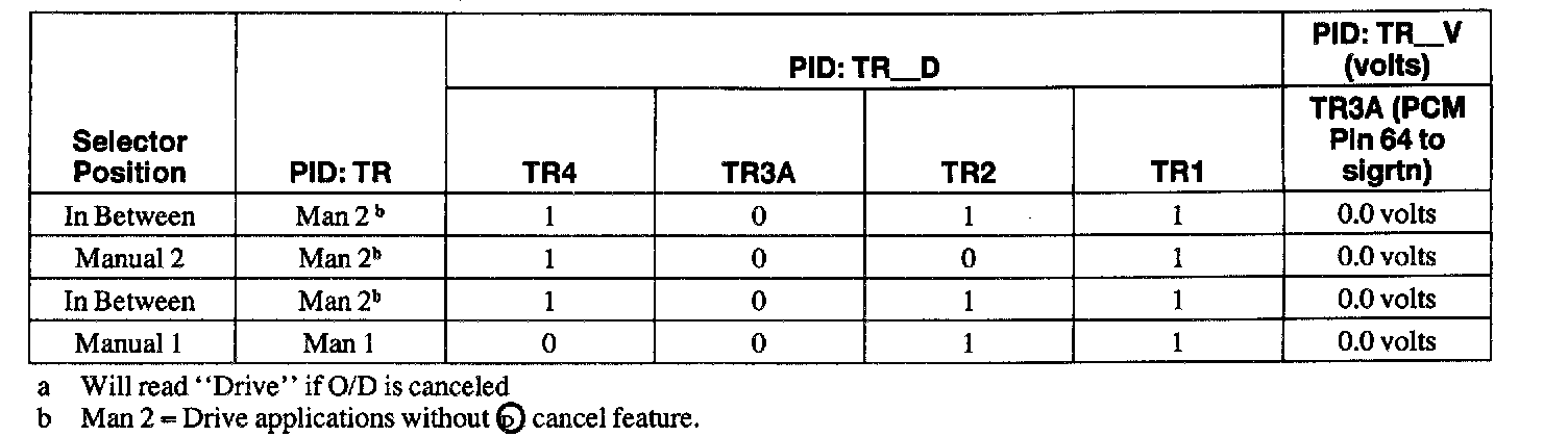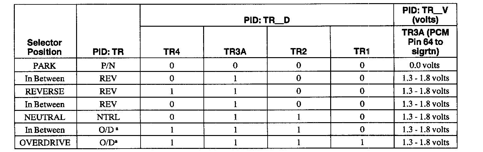 - 1.8 - 5.0 volts=Invalid Reading (open in wires or bad resistor in digital TR sensor).