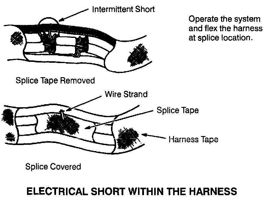 The following illustrations are known examples of wiring harness, splices and connectors that will create intermittent electrical concerns. The concerns are hidden and can only be discovered by a physical evaluation as shown in each illustration.