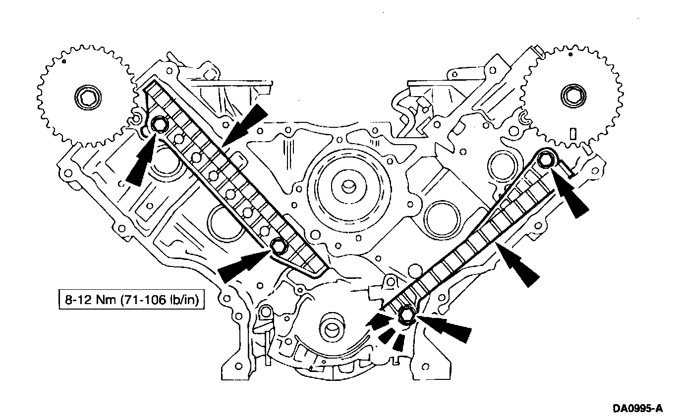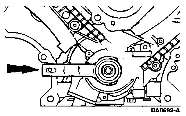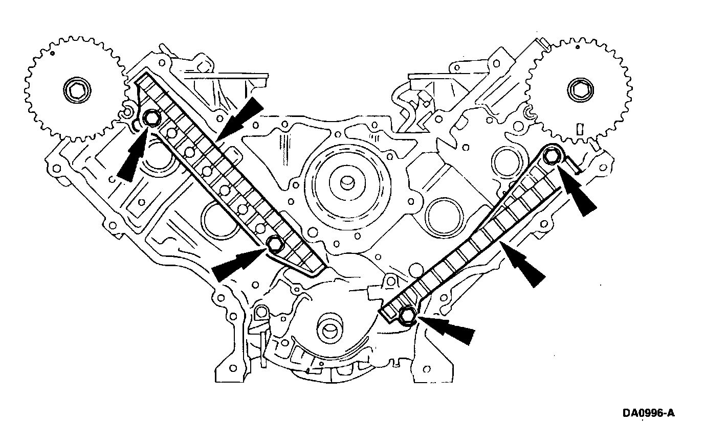14. Position the LH and RH timing chain tensioner arms on the dowel pins. Position the timing chain tensioners and install the bolts.