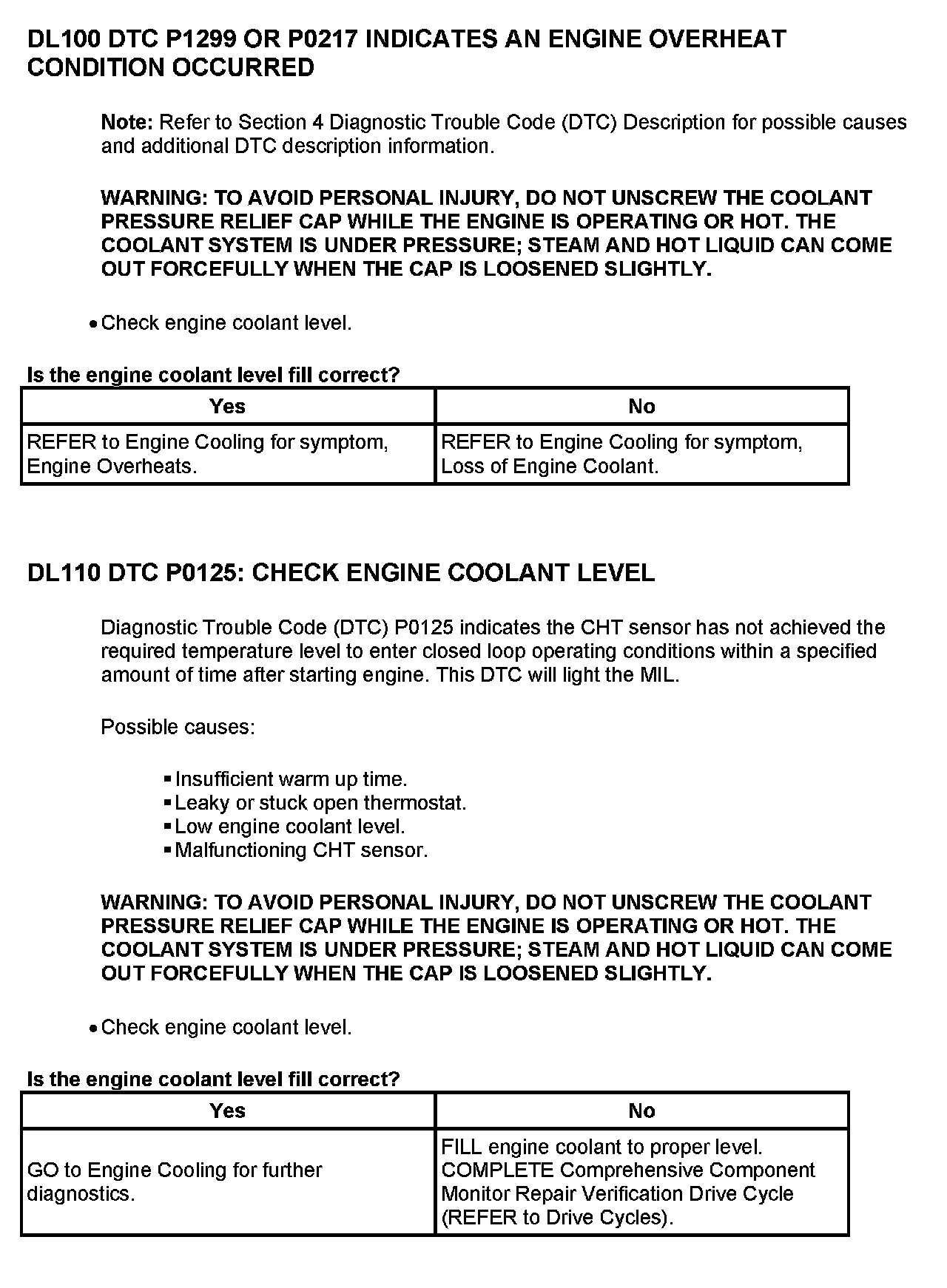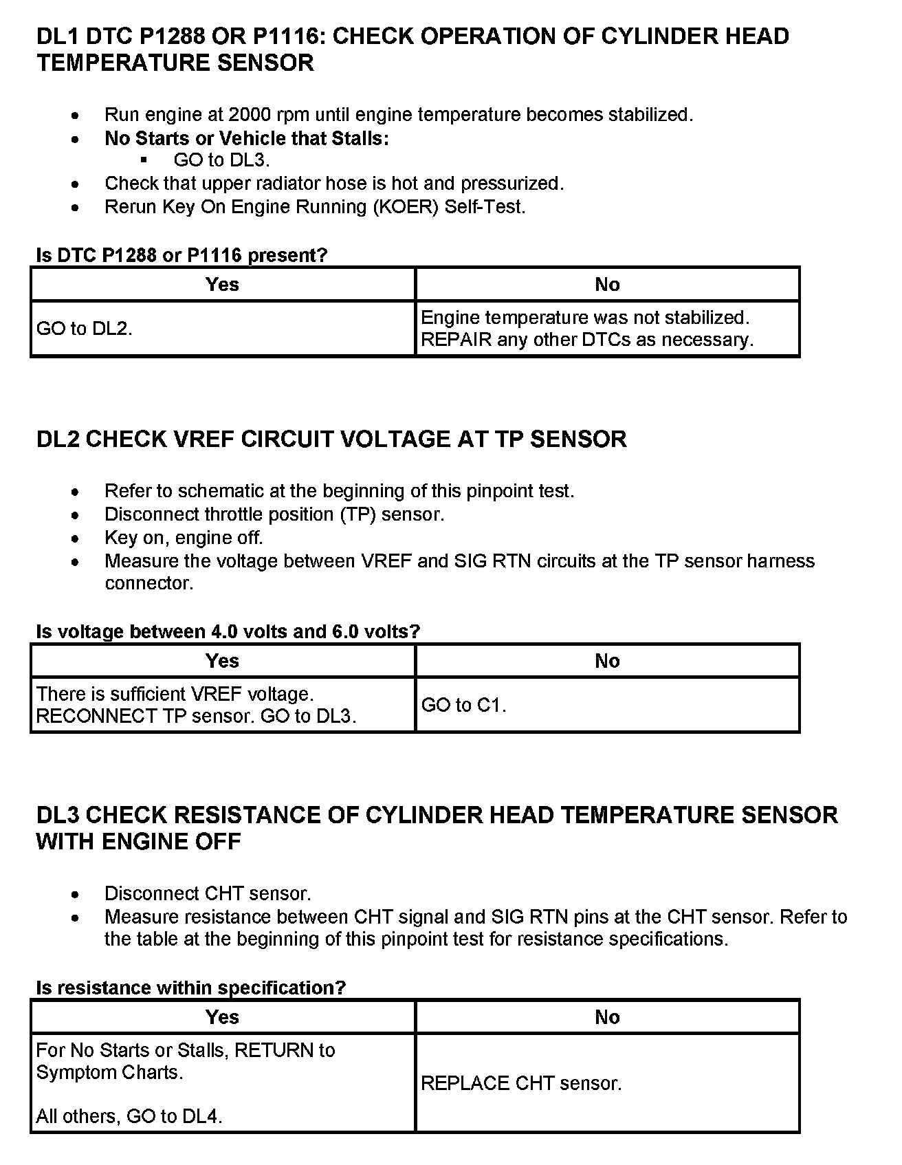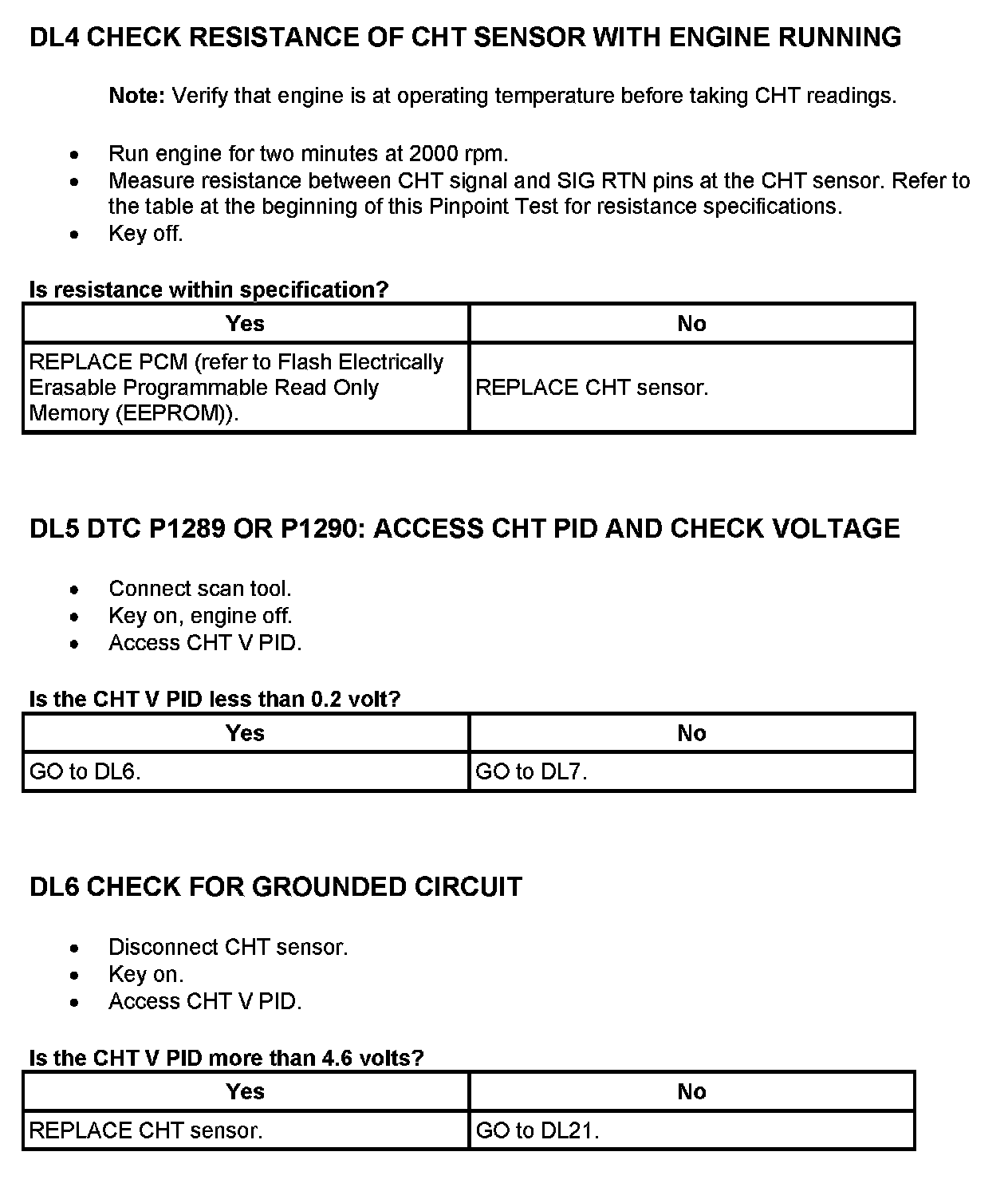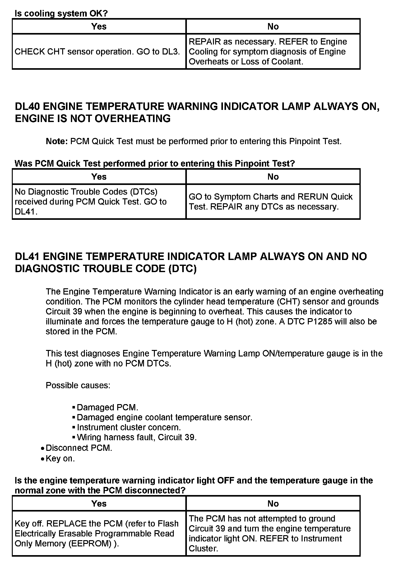 On applications that do not use a ECT sensor, the CHT sensor is used to determine the engine coolant temperature in place of the ECT sensor. In this case the PCM may store both CHT and ECT Diagnostic Trouble Codes (DTCs). To cover the entire temperature range of both the CHT and Engine Coolant Temperature (ECT) sensors, the PCM has a dual switching resistor circuit on the CHT input. A graph showing the temperature switching from the COLD END line to the HOT END line with increasing temperature and back with decreasing temperature is included. Note the temperature to voltage overlap zone. Within this zone it is possible to have either a COLD END or HOT END voltage at the same temperature. For example, at 90°C (194°F) the voltage could read either 0.60 volt or 3.71 volts. Refer to the table for the temperature to voltage expected values.