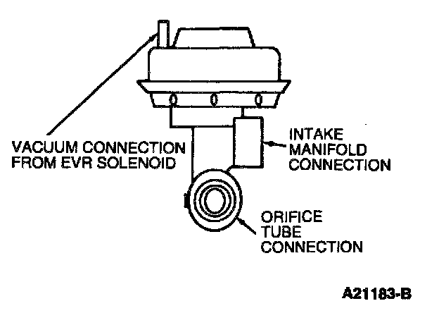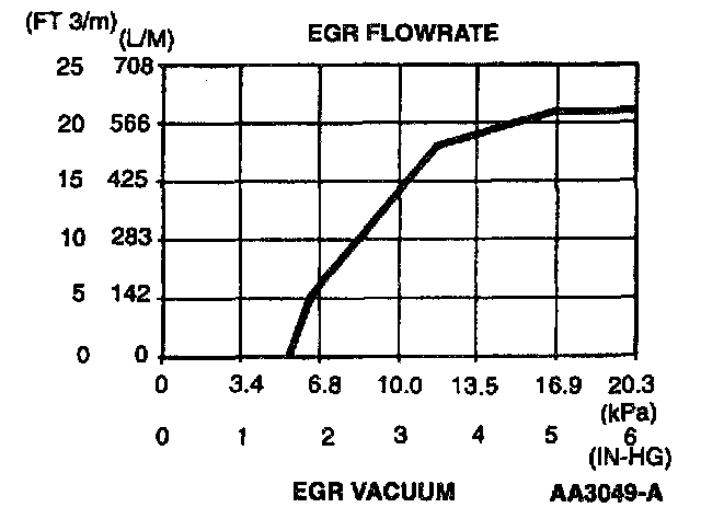 The EGR valve in the Differential Pressure Feedback EGR system is a conventional, vacuum-actuated EGR valve. The valve increases or decreases the flow of exhaust gas recirculation. As vacuum applied to the EGR valve diaphragm overcomes the spring force, the valve begins to open. As the vacuum signal weakens, at 5.4 kPa (1.6 in-Hg) or less, the spring force closes the valve. The EGR valve is fully open at about 15 kPa (4.5 in-Hg).