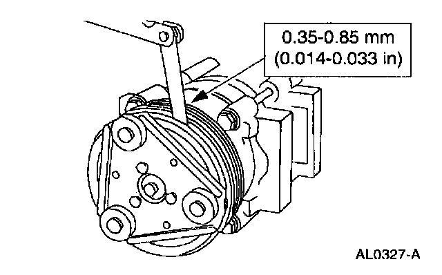 8. Measure and adjust the clutch air gap by removing or adding the A/C clutch hub spacer.