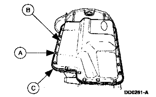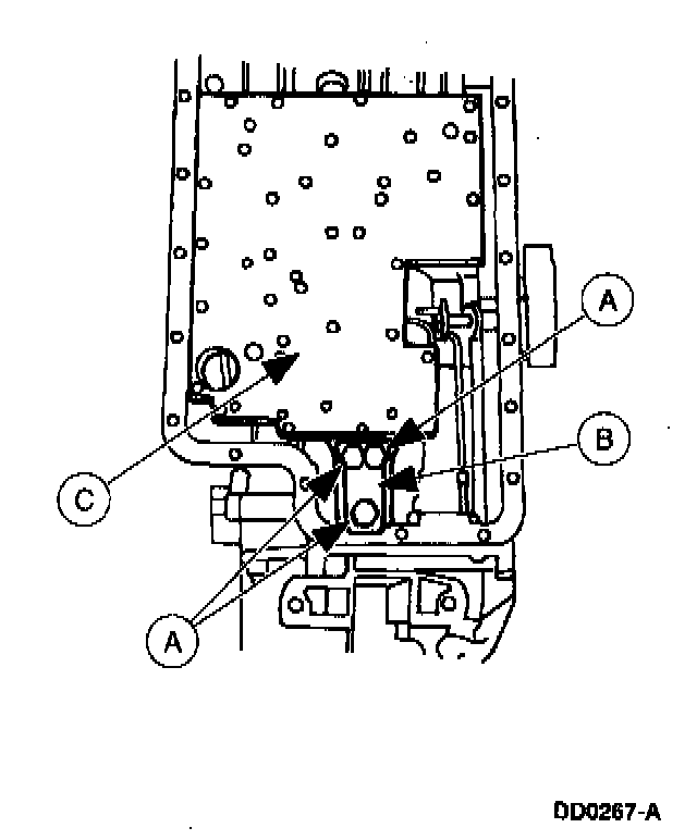 Remove the 20 (A) bolts, the (B) transmission fluid pan, and the (C) gasket.