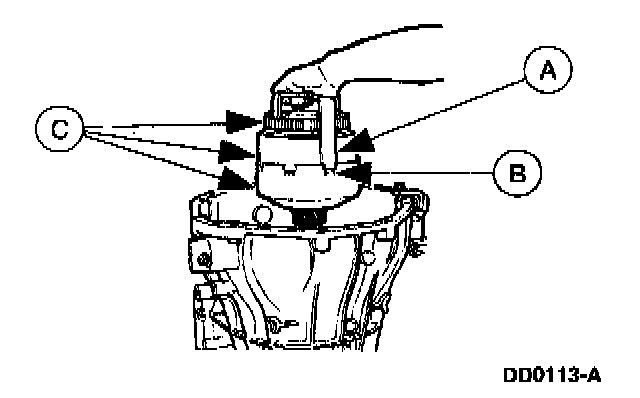 12. Remove the (A) bolts, the (B) nut, and the (C) solenoid body assembly, by pushing the solenoid body connector upward to help separate the assembly from the case bore.