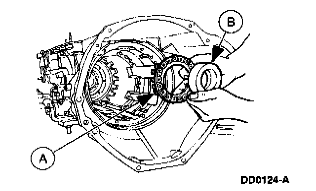 44. Remove the (A) reverse clutch return spring assembly and the (B) low/reverse one-way clutch inner race.