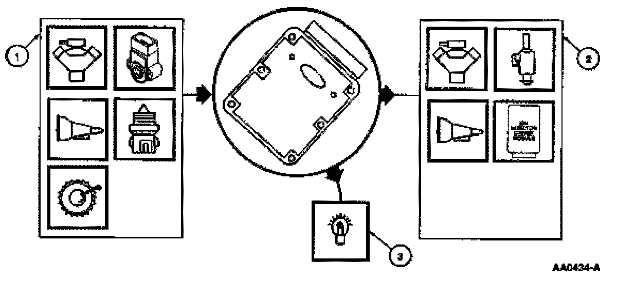 Each illustration depicts the Powertrain Control Module (PCM) as the main focus with the primary inputs and outputs for each monitor. The icons to the left of the PCM represent the inputs used by each of the monitor strategies to enable or activate the monitor. The components and subsystems to the right of the PCM represent the hardware and signals used while performing the tests and the systems being tested. The Comprehensive Component Monitor illustration has numerous components and signals involved and is shown generically. When referring to the illustrations, match the numbers to the corresponding numbers in the monitor descriptions for a better comprehension of the monitor and associated Diagnostic Trouble Codes (DTCs).