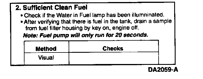 If engine oil is present in the fuel it may indicate an injector 0-ring leak and subsequent loss of rail pressure. If that is suspected, check rail pressure during engine cranking (refer to Hard Start/No Start Diagnostic Procedures Step 9C). Hard Start/No Start Diagnostic Procedures