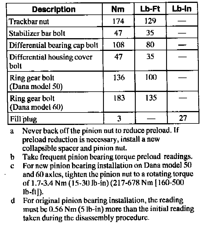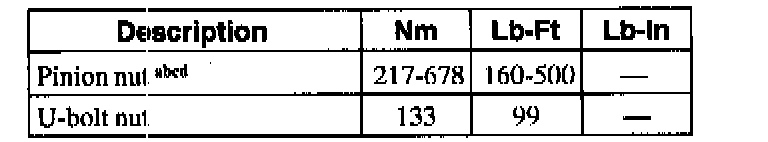 c For new pinion bearing installation on Dana model 50 and 60 axles, tighten the pinion nut to a rotating torque of 1.7 - 3.4 Nm (15 - 30 inch lbs.) (217 - 678 Nm [160 - 500 ft. lbs.]).