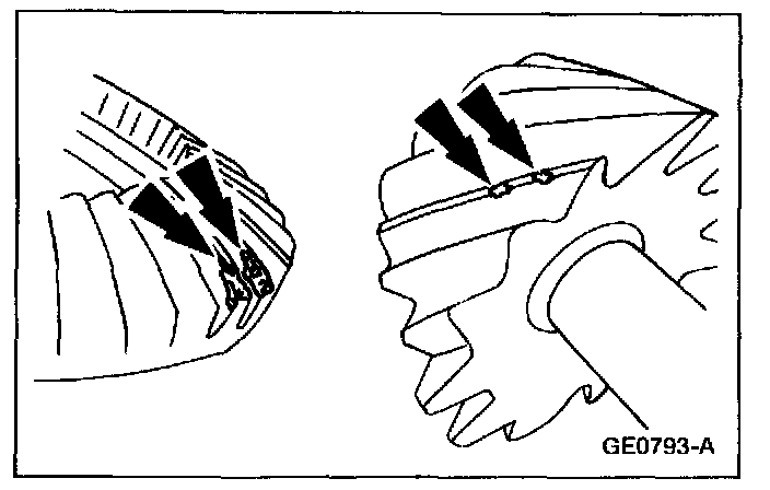 To check the differential ring gear and pinion, remove as much lubricant as possible from the gears with clean solvent. Wipe the gears dry or blow them dry with compressed air. Look for scored or damaged teeth. Also look for cracks or other damage.