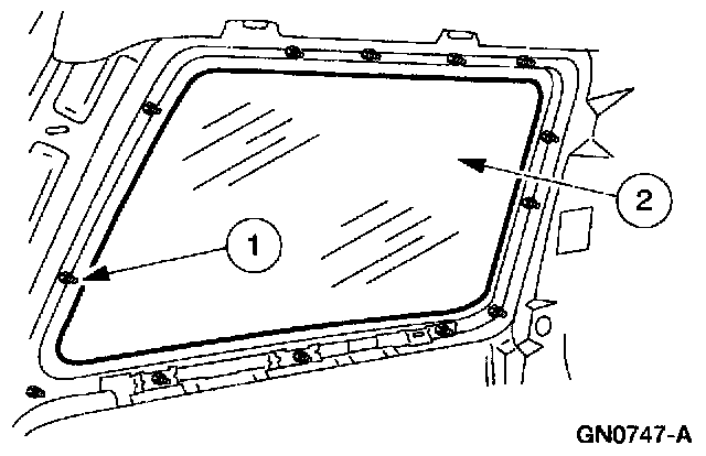 ^ Starting at the bottom middle and working around the frame, apply an 8-mm (0.32-in) bead of foam butyl sealant meeting Ford specification WSB-M2G234-C to the rear quarter window glass frame.