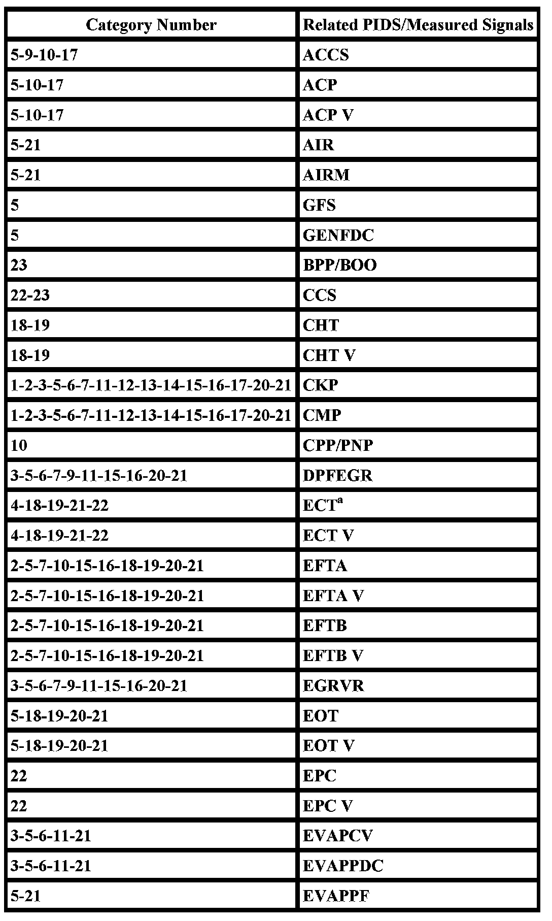 The listing reflects PIDS and/or measured values which may reveal a possible concern within each system shown. Match the category number with the related PID/measured signal and proceed to the Typical Diagnostic Reference Value Charts.