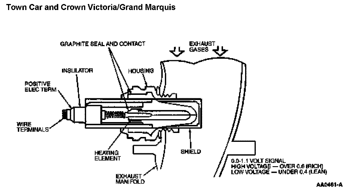 The heated oxygen sensor (HO2S) (Figure 32) detects the presence of oxygen in the exhaust and produces a variable voltage according to the amount of oxygen detected. A high concentration of oxygen (lean air/fuel ratio) in the exhaust produces a low voltage signal less than 0.4 volt. A low concentration of oxygen (rich air/fuel ratio) produces a high voltage signal greater than 0.6 volt. The HO2S provides feedback to the PCM indicating air/fuel ratio in order to achieve a near stoichiometric air/fuel ratio of 14.7:1 during closed loop engine operation. The HO2S generates a voltage between 0.0 and 1.1 volts.