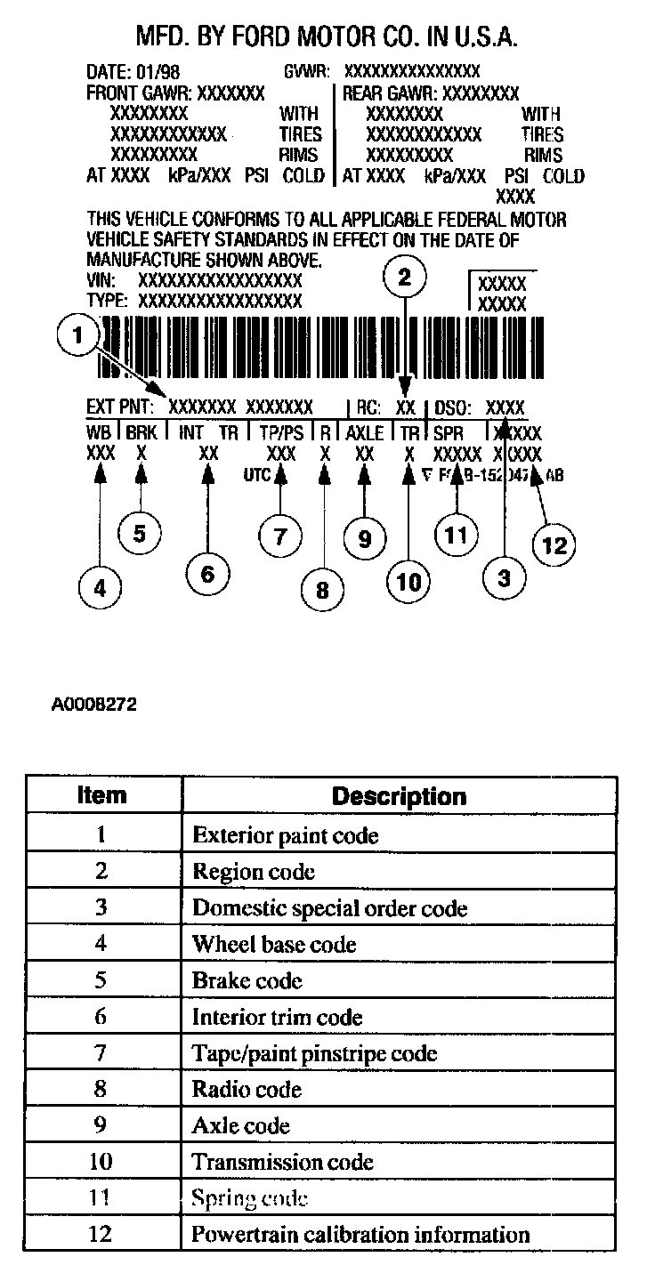 The vehicle certification (VC) label contains the manufacturer name, the month and year of manufacture, the certification statement, and the VIN. It also includes gross Vehicle Weight Ratings (GVWR).