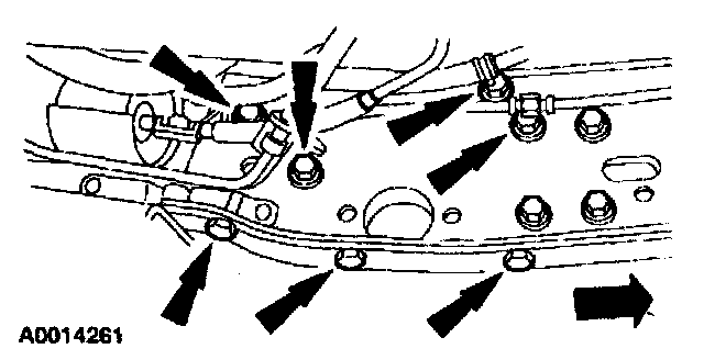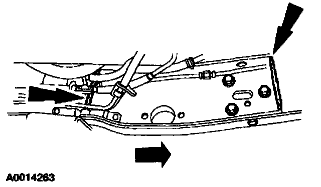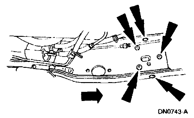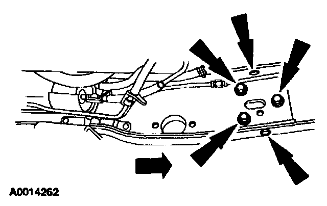 5 Remove the exhaust system components as necessary to access the front stub-to-reinforcement rivets.