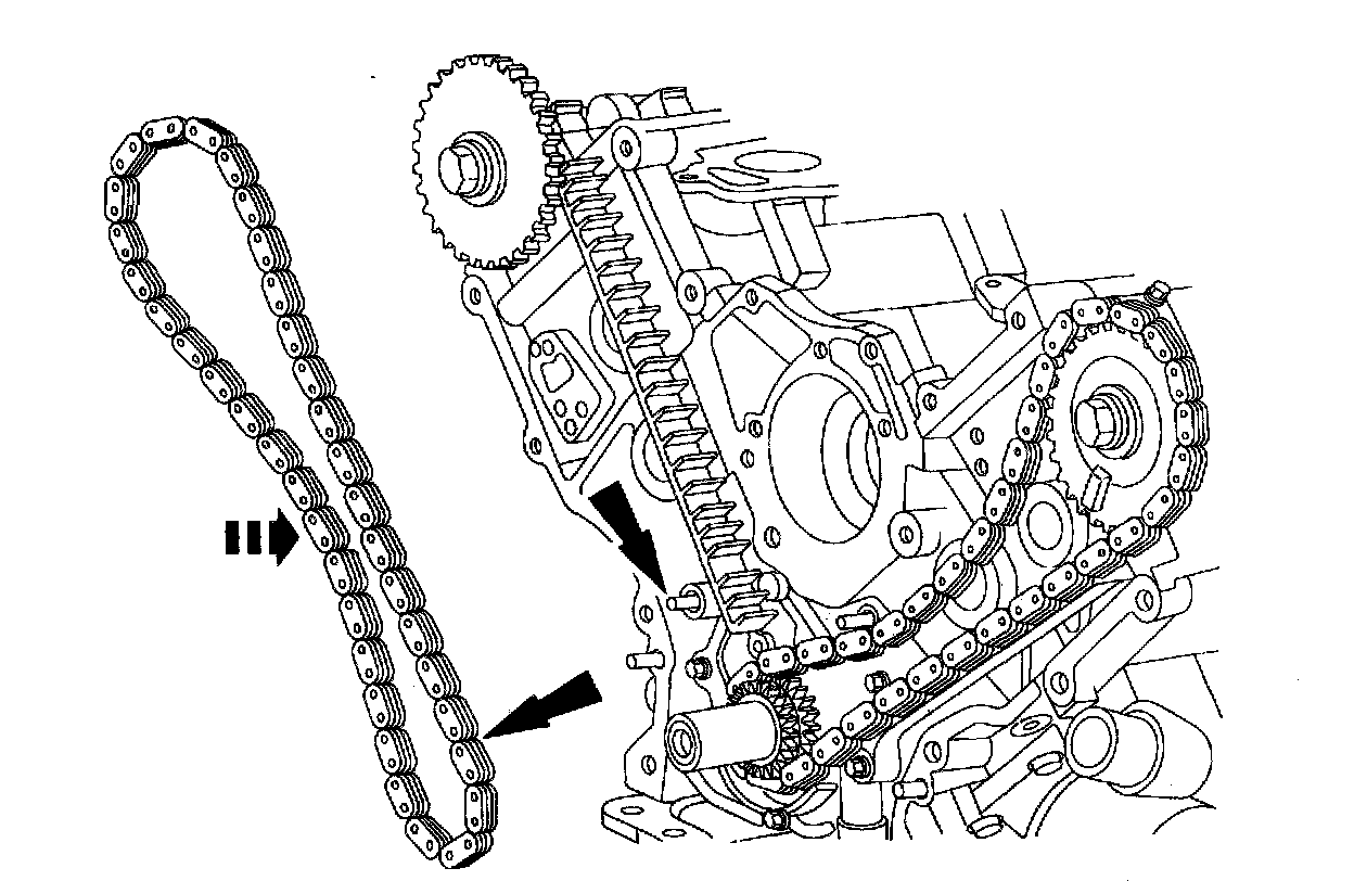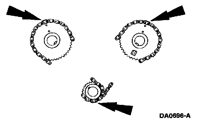 - LH timing chain on the camshaft sprocket with the two chain links and timing marks aligned.