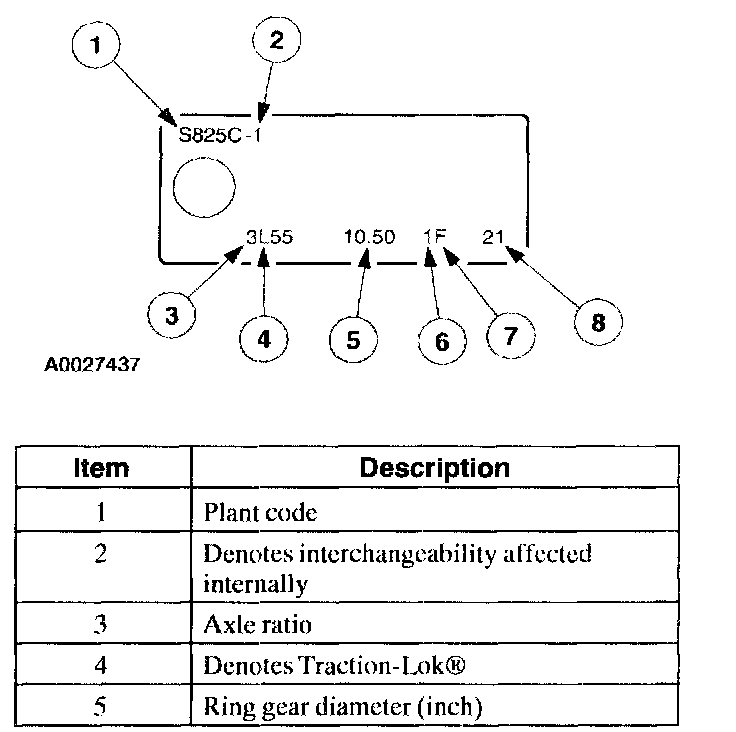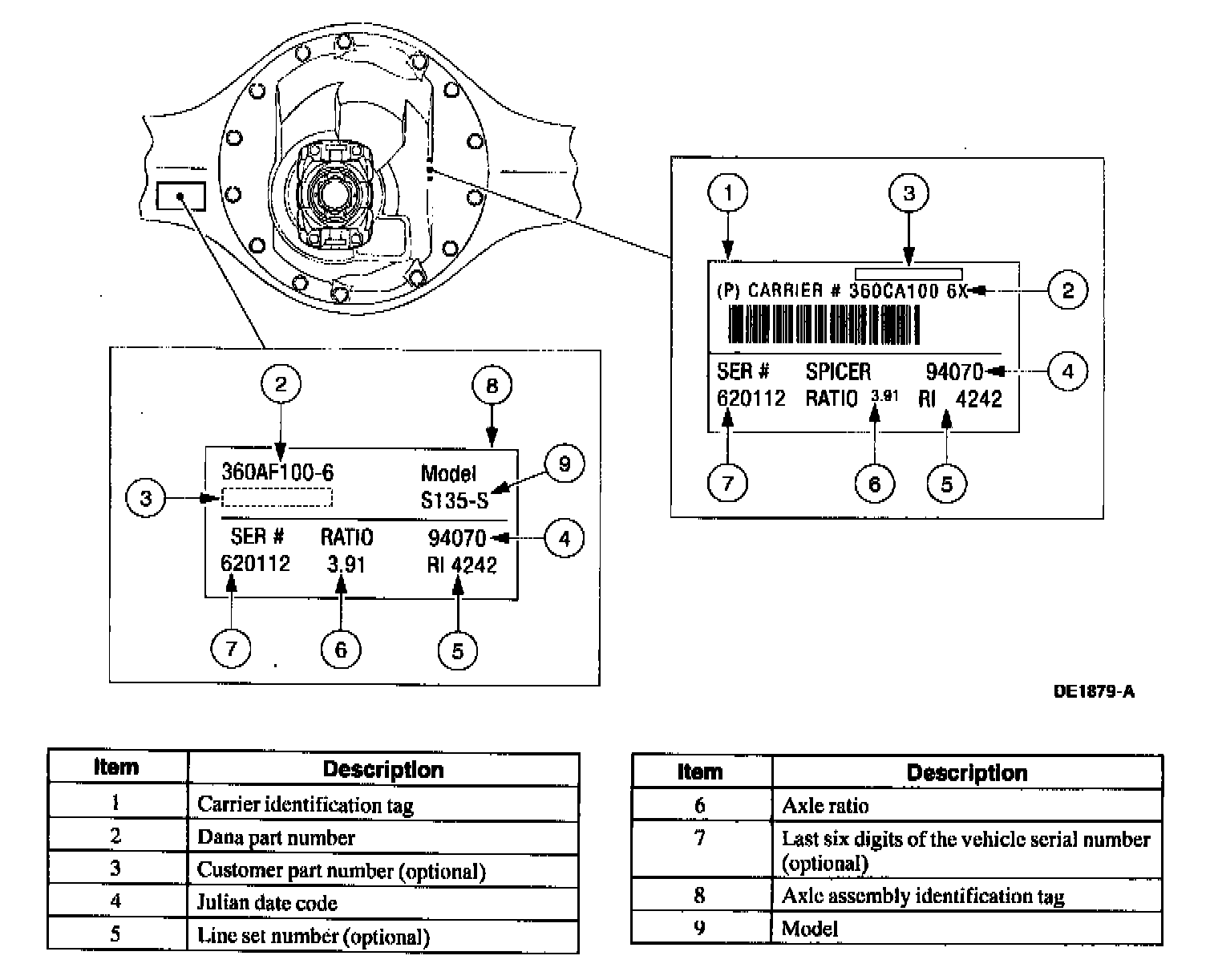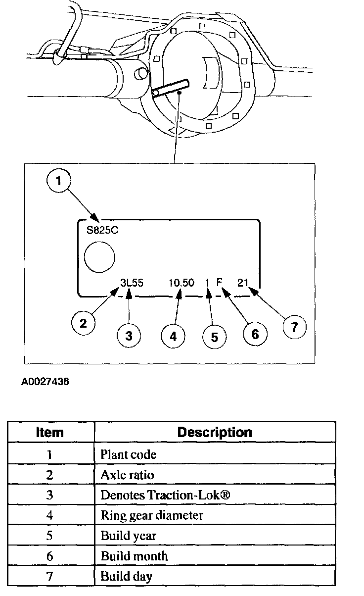 The axle identification tag identifies a particular axle design, a specific ratio, and if it is a conventional or limited slip (Traction-Lok) type. In addition, the plant code will not change as long as that particular axle assembly never undergoes an external design change. If, however, an internal design change takes place during the production life of the axle and that internal change affects parts interchangeability, a dash and numerical suffix is added to the plant code. This means that as an assembly both axles are interchangeable; however, internally they are different. Therefore, each requires different internal parts at the time of repair.