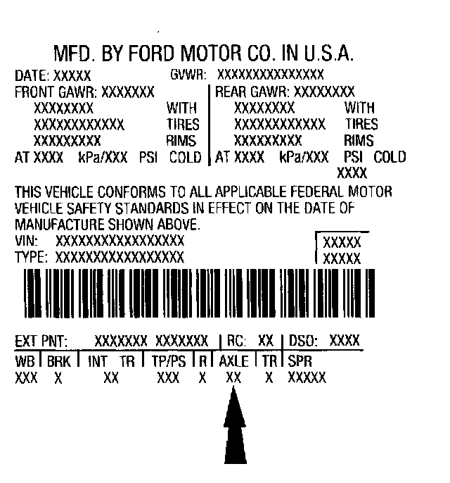 Vehicle Certification (VC) Label ExampleThe Vehicle Certification (VC) label is located in the driver doorjamb. The first two digits of the axle code indicate the rear axle and the third digit refers to the front axle, if so equipped.