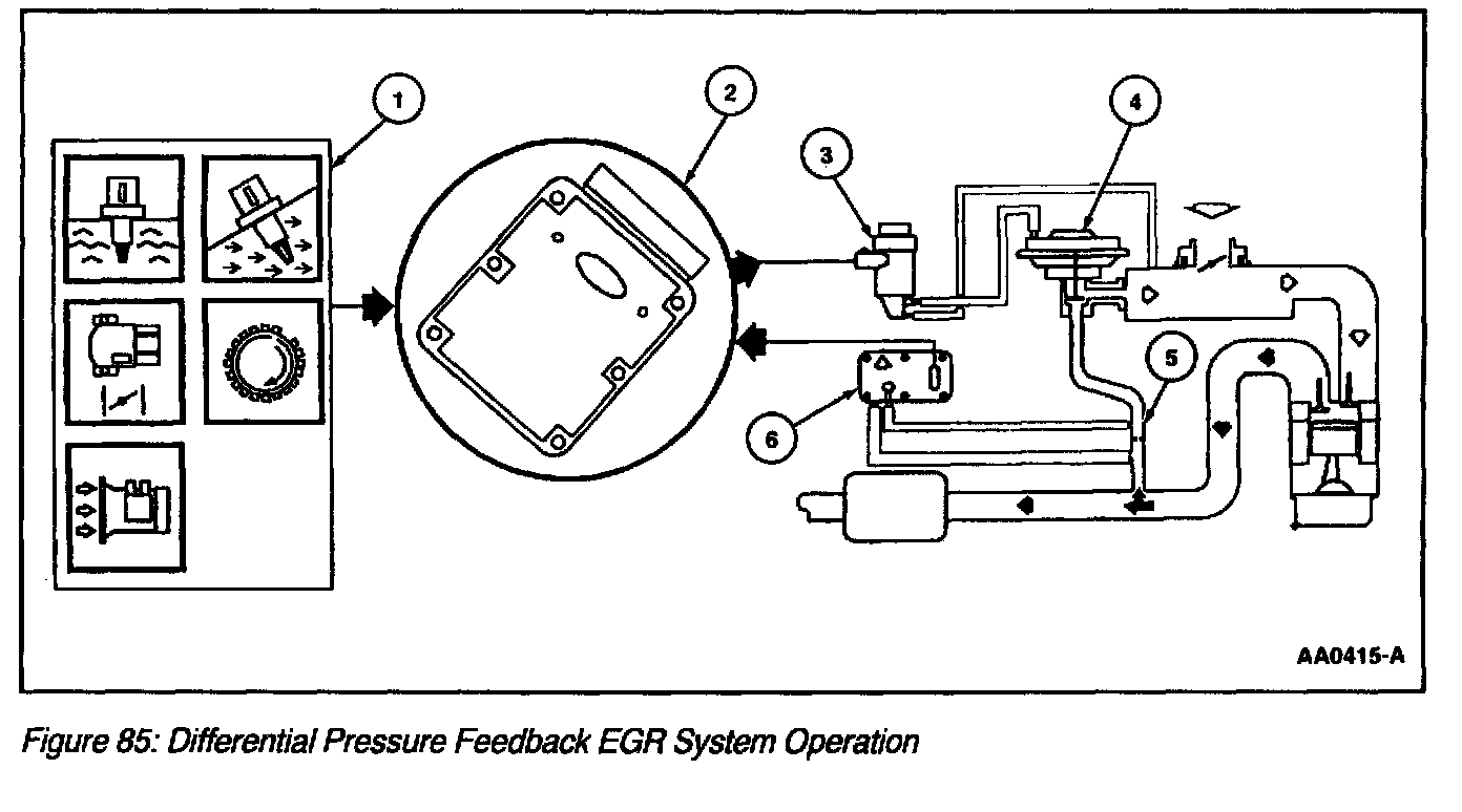 The Differential Pressure Feedback EGR system consists of a differential pressure feedback EGR sensor, EGR vacuum regulator solenoid, EGR valve, orifice tube assembly, Powertrain Control Module (PCM) and connecting wires and vacuum hoses. Operation of the system is as follows (Figure 85):