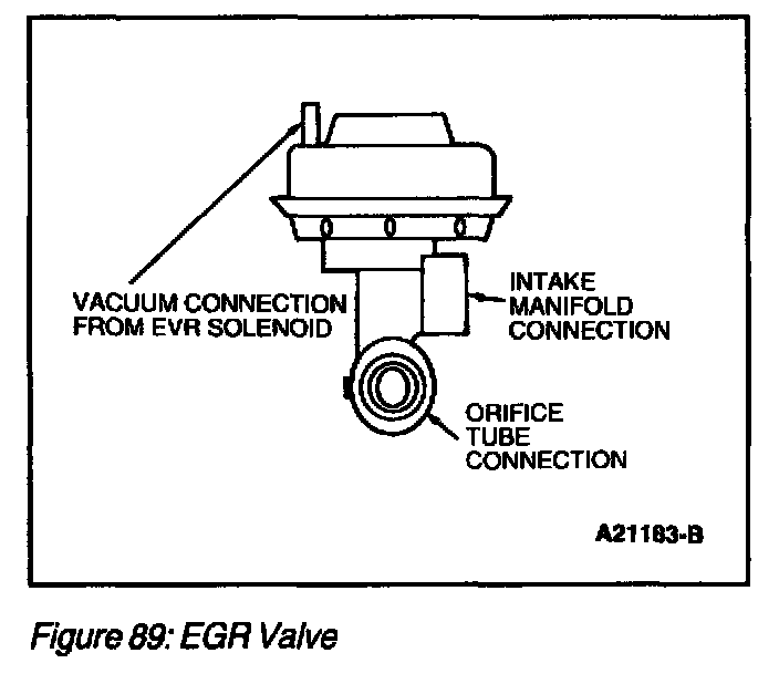 The EGR valve (Figure 89) in the Differential Pressure Feedback EGR system is a conventional, vacuum-actuated EGR valve. The valve increases or decreases the flow of exhaust gas recirculation. As vacuum applied to the EGR valve diaphragm overcomes the spring force, the valve begins to open. As the vacuum signal weakens, at 5.4 kPa (1.6 in-Hg) or less, the spring force closes the valve. The EGR valve is fully open at about 15 kPa (4.5 in-Hg).